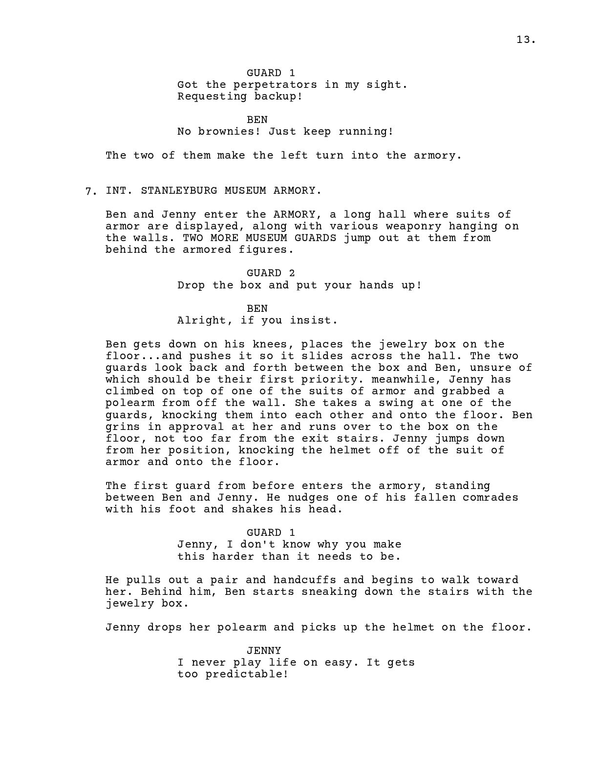 BEN No brownies! Just keep running! The two of them make the left turn into the armory. INT. STANLEYBURG MUSEUM ARMORY. Ben and Jenny enter the ARMORY, a long hall where suits of armor are displayed, along with various weaponry hanging on the walls. TWO MORE MUSEUM GUARDS jump out at them from behind the armored figures. GUARD 2 Drop the box and put your hands up! BEN Alright, if you insist. Ben gets down on his knees, places the jewelry box on the floor...and pushes it so it slides across the hall. The two guards look back and forth between the box and Ben, unsure of which should be their first priority. meanwhile, Jenny has climbed on top of one of the suits of armor and grabbed a polearm from off the wall. She takes a swing at one of the guards, knocking them into each other and onto the floor. Ben grins in approval at her and runs over to the box on the floor, not too far from the exit stairs. Jenny jumps down from her position, knocking the helmet off of the suit of armor and onto the floor. The first guard from before enters the armory, standing between Ben and Jenny. He nudges one of his fallen comrades with his foot and shakes his head. GUARD 1 Jenny, I don't know why you make this harder than it needs to be. He pulls out a pair and handcuffs and begins to walk toward her. Behind him, Ben starts sneaking down the stairs with the jewelry box. Jenny drops her polearm and picks up the helmet on the floor. JENNY I never play life on easy. It gets too predictable! She throws the helmet at the guard like a bowling ball, 7. 13.