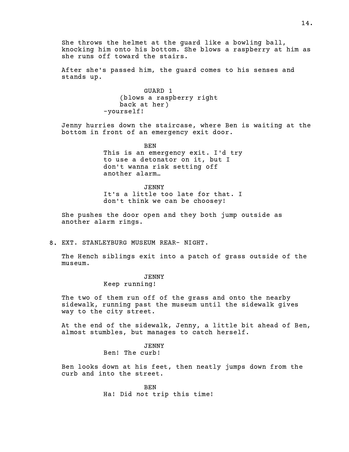 ball, knocking him onto his bottom. She blows a raspberry at him as she runs off toward the stairs. After she's passed him, the guard comes to his senses and stands up. GUARD 1 (blows a raspberry right back at her) -yourself! Jenny hurries down the staircase, where Ben is waiting at the bottom in front of an emergency exit door. BEN This is an emergency exit. I'd try to use a detonator on it, but I don't wanna risk setting off another alarm… JENNY It's a little too late for that. I don't think we can be choosey! She pushes the door open and they both jump outside as another alarm rings. EXT. STANLEYBURG MUSEUM REAR- NIGHT. The Hench siblings exit into a patch of grass outside of the museum. JENNY Keep running! The two of them run off of the grass and onto the nearby sidewalk, running past the museum until the sidewalk gives way to the city street. At the end of the sidewalk, Jenny, a little bit ahead of Ben, almost stumbles, but manages to catch herself. JENNY Ben! The curb! Ben looks down at his feet, then neatly jumps down from the curb and into the street. BEN Ha! Did not trip this time! JENNY 8. 14.