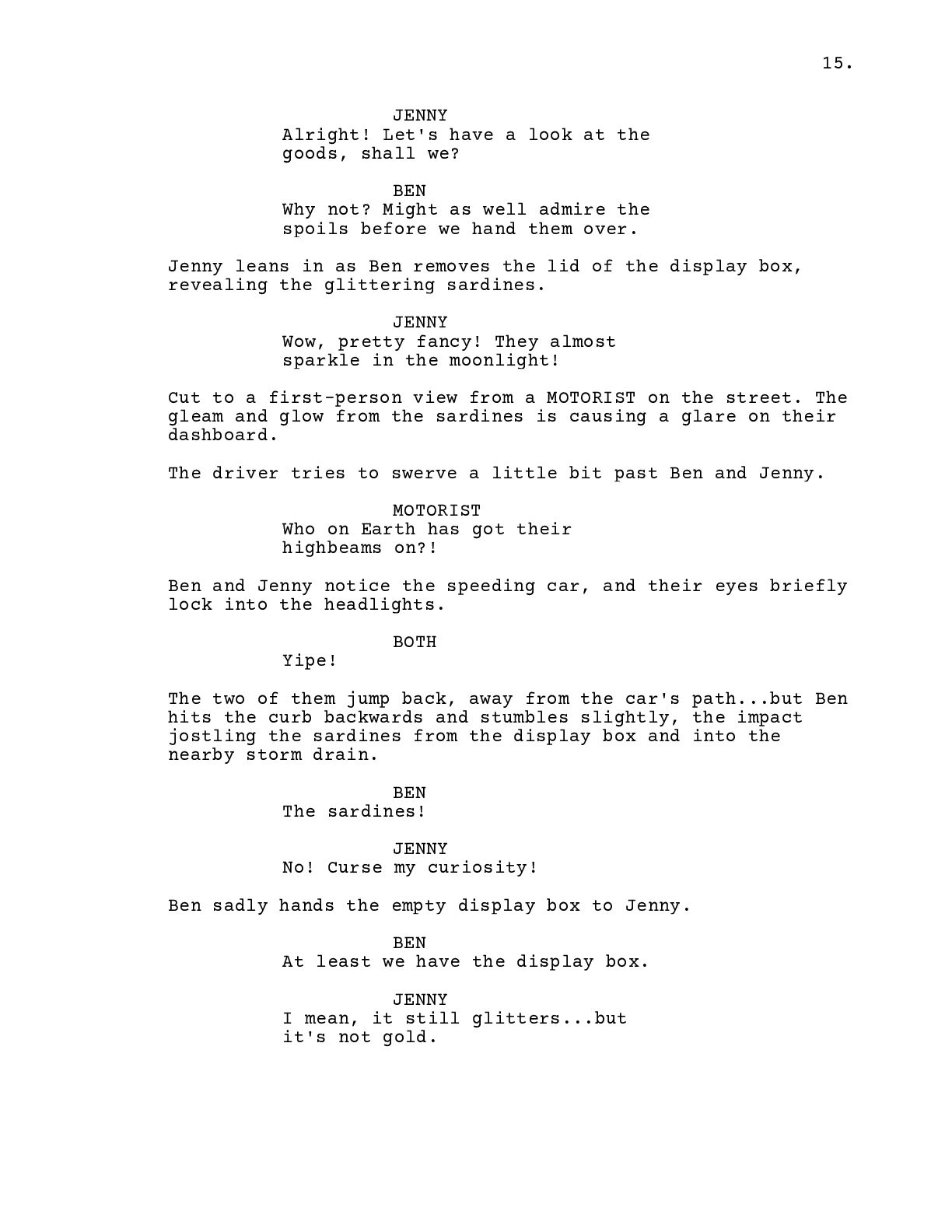 we? BEN Why not? Might as well admire the spoils before we hand them over. Jenny leans in as Ben removes the lid of the display box, revealing the glittering sardines. JENNY Wow, pretty fancy! They almost sparkle in the moonlight! Cut to a first-person view from a MOTORIST on the street. The gleam and glow from the sardines is causing a glare on their dashboard. The driver tries to swerve a little bit past Ben and Jenny. MOTORIST Who on Earth has got their highbeams on?! Ben and Jenny notice the speeding car, and their eyes briefly lock into the headlights. BOTH Yipe! The two of them jump back, away from the car's path...but Ben hits the curb backwards and stumbles slightly, the impact jostling the sardines from the display box and into the nearby storm drain. BEN The sardines! JENNY No! Curse my curiosity! Ben sadly hands the empty display box to Jenny. BEN At least we have the display box. JENNY I mean, it still glitters...but it's not gold. BEN 15.