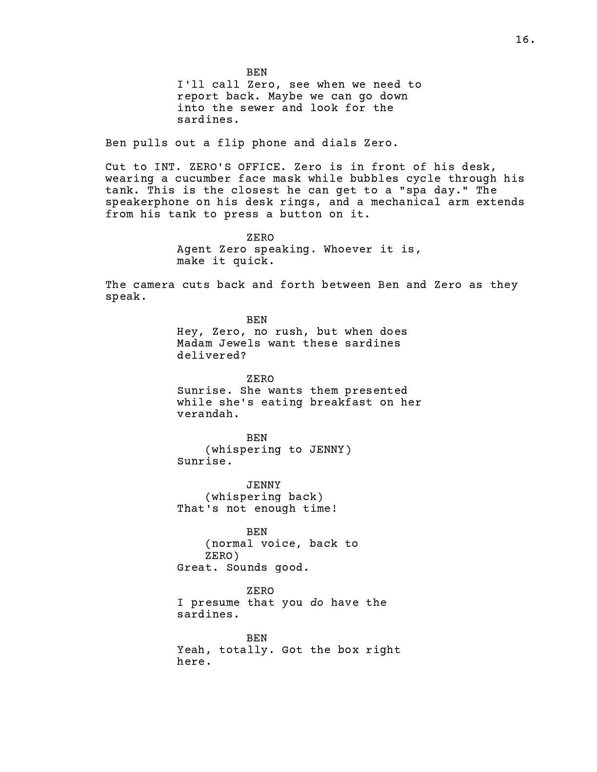 back. Maybe we can go down into the sewer and look for the sardines. Ben pulls out a flip phone and dials Zero. Cut to INT. ZERO'S OFFICE. Zero is in front of his desk, wearing a cucumber face mask while bubbles cycle through his tank. This is the closest he can get to a "spa day." The speakerphone on his desk rings, and a mechanical arm extends from his tank to press a button on it. ZERO Agent Zero speaking. Whoever it is, make it quick. The camera cuts back and forth between Ben and Zero as they speak. BEN Hey, Zero, no rush, but when does Madam Jewels want these sardines delivered? ZERO Sunrise. She wants them presented while she's eating breakfast on her verandah. BEN (whispering to JENNY) Sunrise. JENNY (whispering back) That's not enough time! BEN (normal voice, back to ZERO) Great. Sounds good. ZERO I presume that you do have the sardines. BEN Yeah, totally. Got the box right here. ZERO 16.