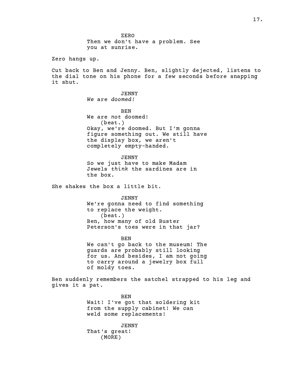 sunrise. Zero hangs up. Cut back to Ben and Jenny. Ben, slightly dejected, listens to the dial tone on his phone for a few seconds before snapping it shut. JENNY We are doomed! BEN We are not doomed! (beat.) Okay, we're doomed. But I'm gonna figure something out. We still have the display box, we aren't completely empty-handed. JENNY So we just have to make Madam Jewels think the sardines are in the box. She shakes the box a little bit. JENNY We're gonna need to find something to replace the weight. (beat.) Ben, how many of old Buster Peterson's toes were in that jar? BEN We can't go back to the museum! The guards are probably still looking for us. And besides, I am not going to carry around a jewelry box full of moldy toes. Ben suddenly remembers the satchel strapped to his leg and gives it a pat. BEN Wait! I've got that soldering kit from the supply cabinet! We can weld some replacements! JENNY That's great! (MORE) JENNY (CONT'D) 17.