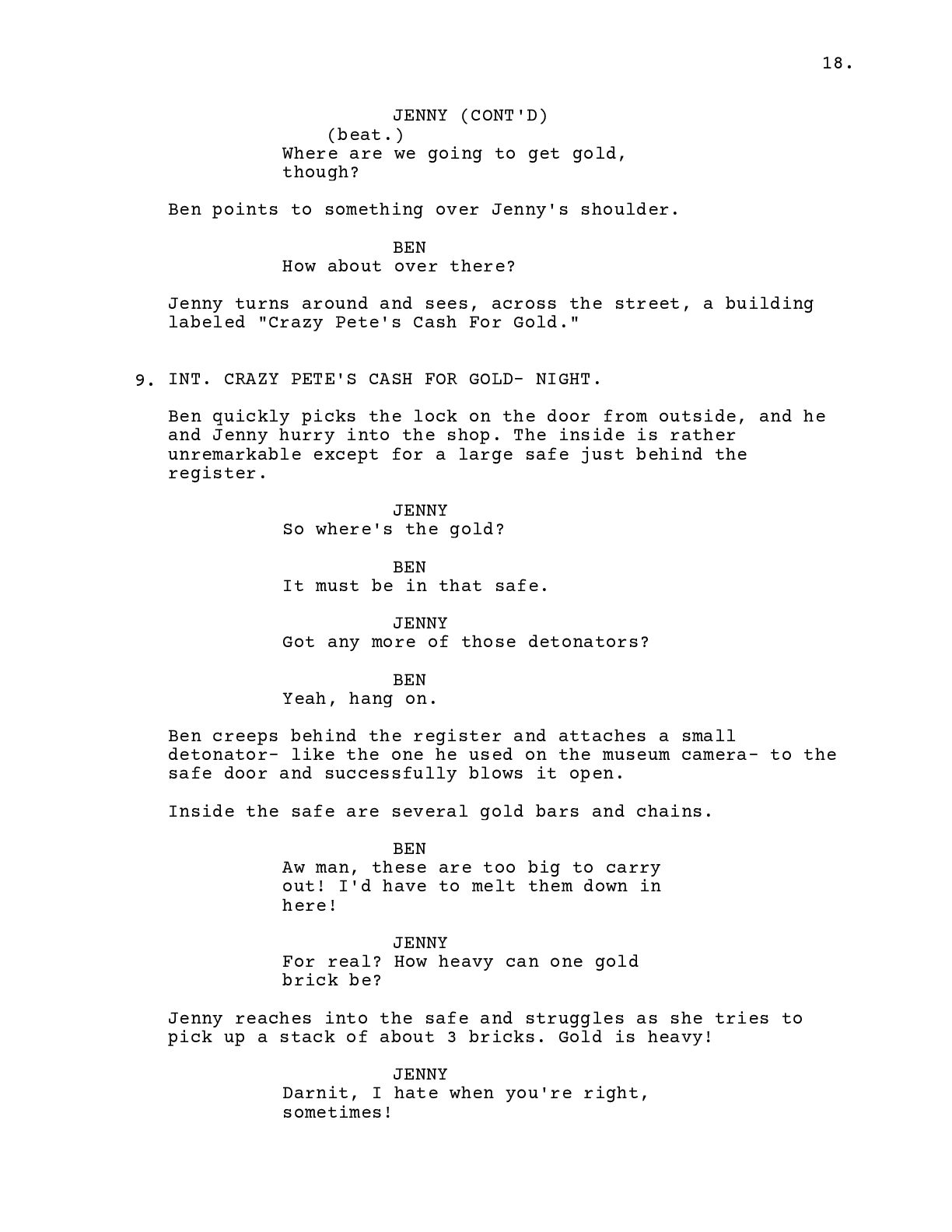 though? Ben points to something over Jenny's shoulder. BEN How about over there? Jenny turns around and sees, across the street, a building labeled "Crazy Pete's Cash For Gold." INT. CRAZY PETE'S CASH FOR GOLD- NIGHT. Ben quickly picks the lock on the door from outside, and he and Jenny hurry into the shop. The inside is rather unremarkable except for a large safe just behind the register. JENNY So where's the gold? BEN It must be in that safe. JENNY Got any more of those detonators? BEN Yeah, hang on. Ben creeps behind the register and attaches a small detonator- like the one he used on the museum camera- to the safe door and successfully blows it open. Inside the safe are several gold bars and chains. BEN Aw man, these are too big to carry out! I'd have to melt them down in here! JENNY For real? How heavy can one gold brick be? Jenny reaches into the safe and struggles as she tries to pick up a stack of about 3 bricks. Gold is heavy! JENNY Darnit, I hate when you're right, sometimes! BEN 9. 18.