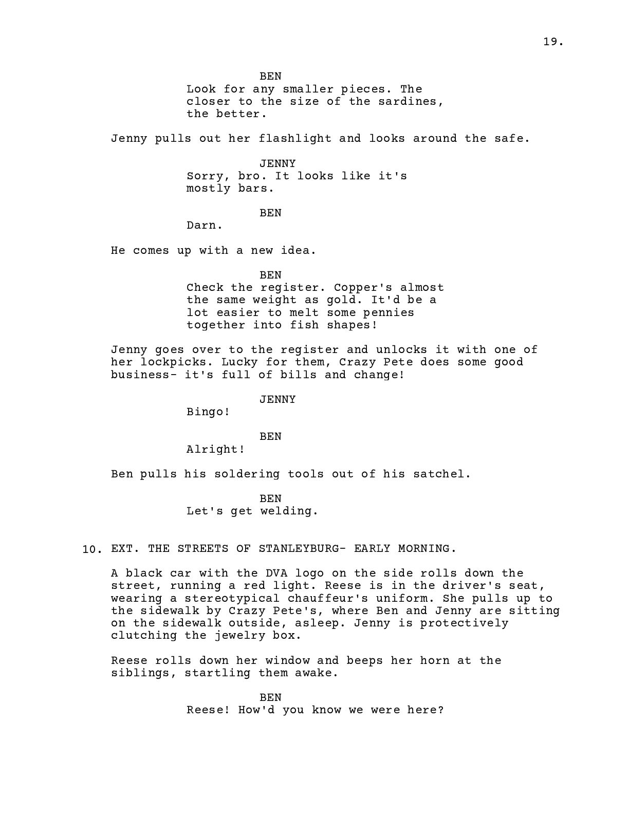 size of the sardines, the better. Jenny pulls out her flashlight and looks around the safe. JENNY Sorry, bro. It looks like it's mostly bars. BEN Darn. He comes up with a new idea. BEN Check the register. Copper's almost the same weight as gold. It'd be a lot easier to melt some pennies together into fish shapes! Jenny goes over to the register and unlocks it with one of her lockpicks. Lucky for them, Crazy Pete does some good business- it's full of bills and change! JENNY Bingo! BEN Alright! Ben pulls his soldering tools out of his satchel. BEN Let's get welding. EXT. THE STREETS OF STANLEYBURG- EARLY MORNING. A black car with the DVA logo on the side rolls down the street, running a red light. Reese is in the driver's seat, wearing a stereotypical chauffeur's uniform. She pulls up to the sidewalk by Crazy Pete's, where Ben and Jenny are sitting on the sidewalk outside, asleep. Jenny is protectively clutching the jewelry box. Reese rolls down her window and beeps her horn at the siblings, startling them awake. BEN Reese! How'd you know we were here? REESE 10. 19.