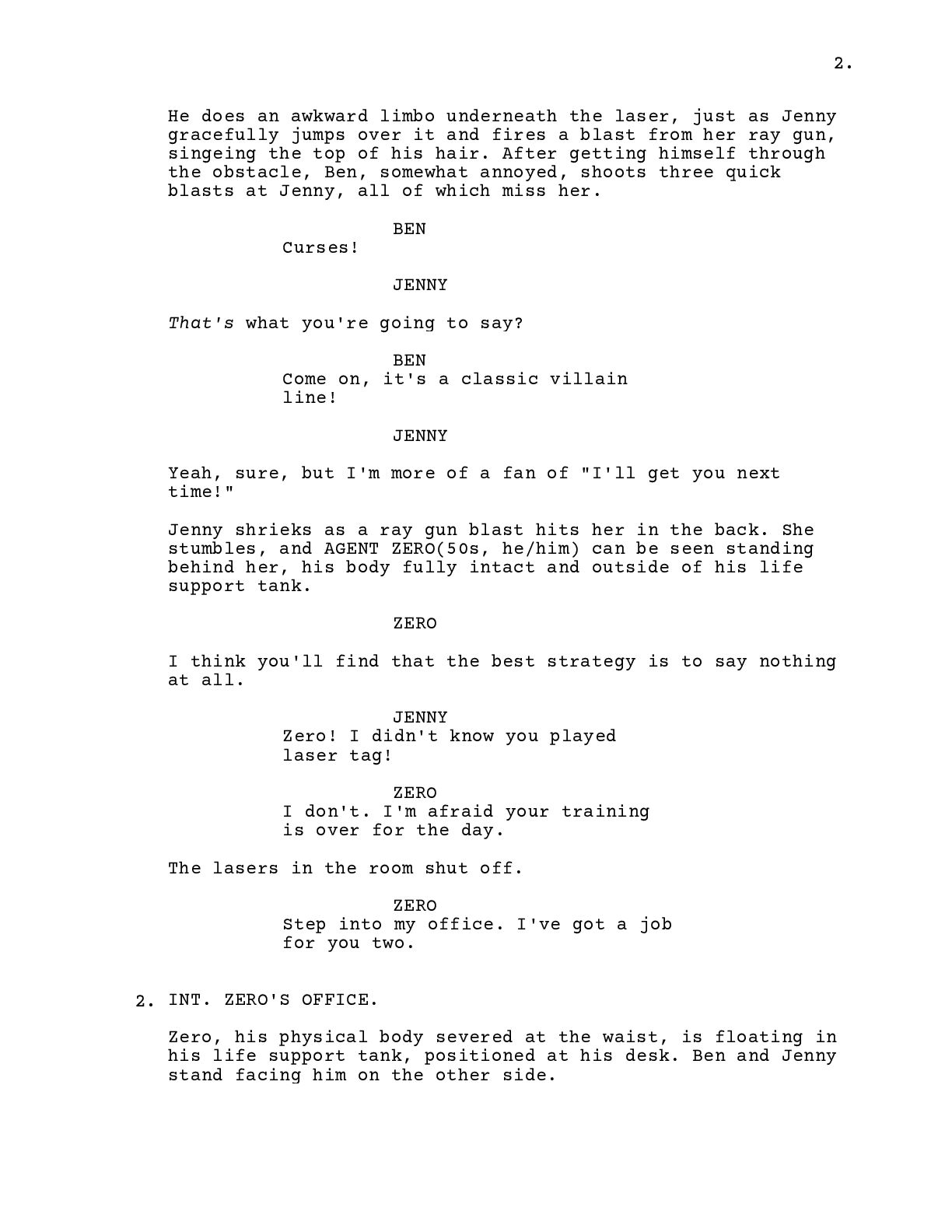 Jenny gracefully jumps over it and fires a blast from her ray gun, singeing the top of his hair. After getting himself through the obstacle, Ben, somewhat annoyed, shoots three quick blasts at Jenny, all of which miss her. BEN Curses! JENNY That's what you're going to say? BEN Come on, it's a classic villain line! JENNY Yeah, sure, but I'm more of a fan of "I'll get you next time!" Jenny shrieks as a ray gun blast hits her in the back. She stumbles, and AGENT ZERO(50s, he/him) can be seen standing behind her, his body fully intact and outside of his life support tank. ZERO I think you'll find that the best strategy is to say nothing at all. JENNY Zero! I didn't know you played laser tag! ZERO I don't. I'm afraid your training is over for the day. The lasers in the room shut off. ZERO Step into my office. I've got a job for you two. INT. ZERO'S OFFICE. Zero, his physical body severed at the waist, is floating in his life support tank, positioned at his desk. Ben and Jenny stand facing him on the other side. A mechanical arm extends from Zero's tank, presenting a 2. 2.