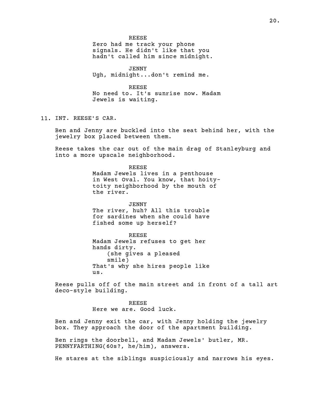 like that you hadn't called him since midnight. JENNY Ugh, midnight...don't remind me. REESE No need to. It's sunrise now. Madam Jewels is waiting. INT. REESE'S CAR. Ben and Jenny are buckled into the seat behind her, with the jewelry box placed between them. Reese takes the car out of the main drag of Stanleyburg and into a more upscale neighborhood. REESE Madam Jewels lives in a penthouse in West Oval. You know, that hoity- toity neighborhood by the mouth of the river. JENNY The river, huh? All this trouble for sardines when she could have fished some up herself? REESE Madam Jewels refuses to get her hands dirty. (she gives a pleased smile) That's why she hires people like us. Reese pulls off of the main street and in front of a tall art deco-style building. REESE Here we are. Good luck. Ben and Jenny exit the car, with Jenny holding the jewelry box. They approach the door of the apartment building. Ben rings the doorbell, and Madam Jewels' butler, MR. PENNYFARTHING(60s?, he/him), answers. He stares at the siblings suspiciously and narrows his eyes. Ben clears his throat and introduces them 11. 20.