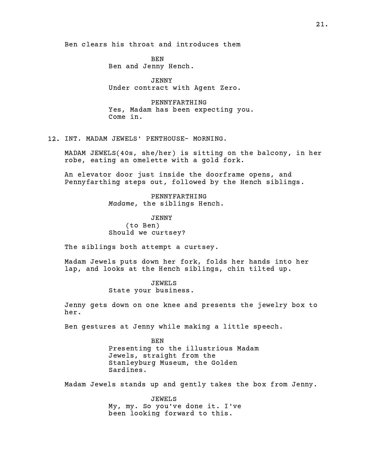 Jenny Hench. JENNY Under contract with Agent Zero. PENNYFARTHING Yes, Madam has been expecting you. Come in. INT. MADAM JEWELS' PENTHOUSE- MORNING. MADAM JEWELS(40s, she/her) is sitting on the balcony, in her robe, eating an omelette with a gold fork. An elevator door just inside the doorframe opens, and Pennyfarthing steps out, followed by the Hench siblings. PENNYFARTHING Madame, the siblings Hench. JENNY (to Ben) Should we curtsey? The siblings both attempt a curtsey. Madam Jewels puts down her fork, folds her hands into her lap, and looks at the Hench siblings, chin tilted up. JEWELS State your business. Jenny gets down on one knee and presents the jewelry box to her. Ben gestures at Jenny while making a little speech. BEN Presenting to the illustrious Madam Jewels, straight from the Stanleyburg Museum, the Golden Sardines. Madam Jewels stands up and gently takes the box from Jenny. JEWELS My, my. So you've done it. I've been looking forward to this. Madam Jewels places the jewelry box on her table and 12. 21.
