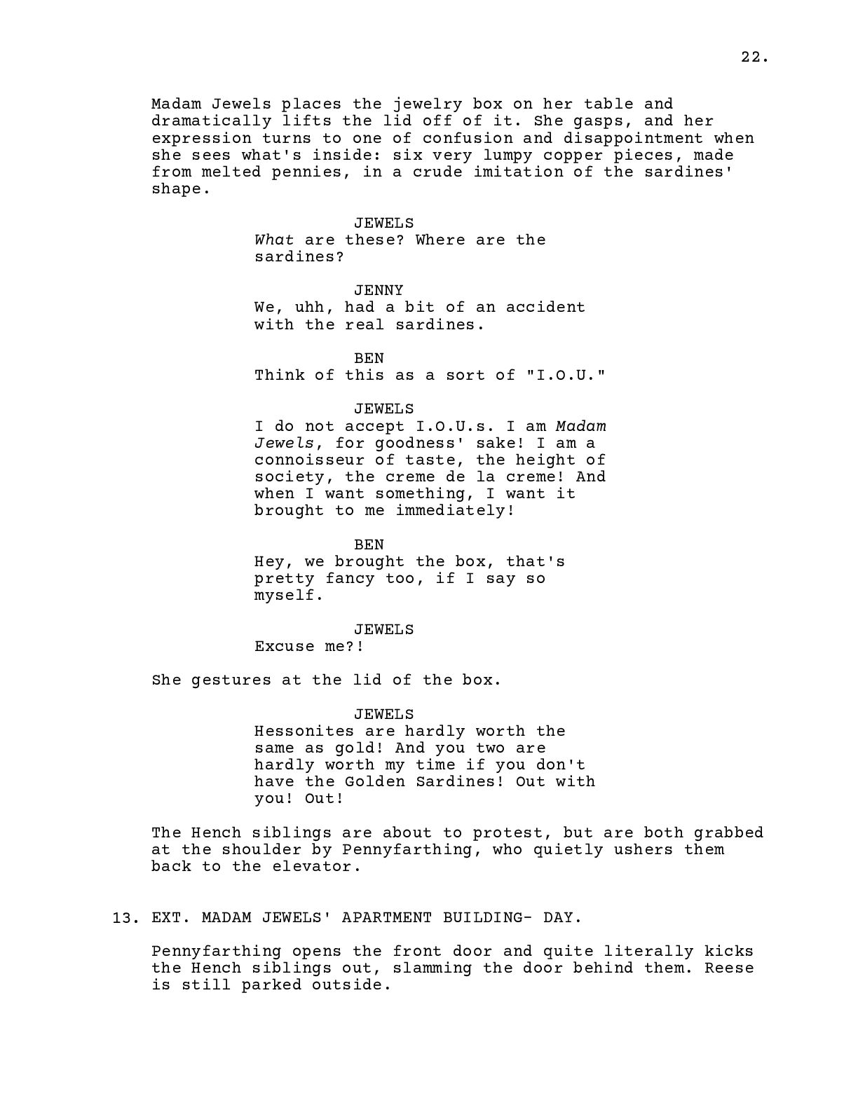 dramatically lifts the lid off of it. She gasps, and her expression turns to one of confusion and disappointment when she sees what's inside: six very lumpy copper pieces, made from melted pennies, in a crude imitation of the sardines' shape. JEWELS What are these? Where are the sardines? JENNY We, uhh, had a bit of an accident with the real sardines. BEN Think of this as a sort of "I.O.U." JEWELS I do not accept I.O.U.s. I am Madam Jewels, for goodness' sake! I am a connoisseur of taste, the height of society, the creme de la creme! And when I want something, I want it brought to me immediately! BEN Hey, we brought the box, that's pretty fancy too, if I say so myself. JEWELS Excuse me?! She gestures at the lid of the box. JEWELS Hessonites are hardly worth the same as gold! And you two are hardly worth my time if you don't have the Golden Sardines! Out with you! Out! The Hench siblings are about to protest, but are both grabbed at the shoulder by Pennyfarthing, who quietly ushers them back to the elevator. EXT. MADAM JEWELS' APARTMENT BUILDING- DAY. Pennyfarthing opens the front door and quite literally kicks the Hench siblings out, slamming the door behind them. Reese is still parked outside. BEN 13. 22.