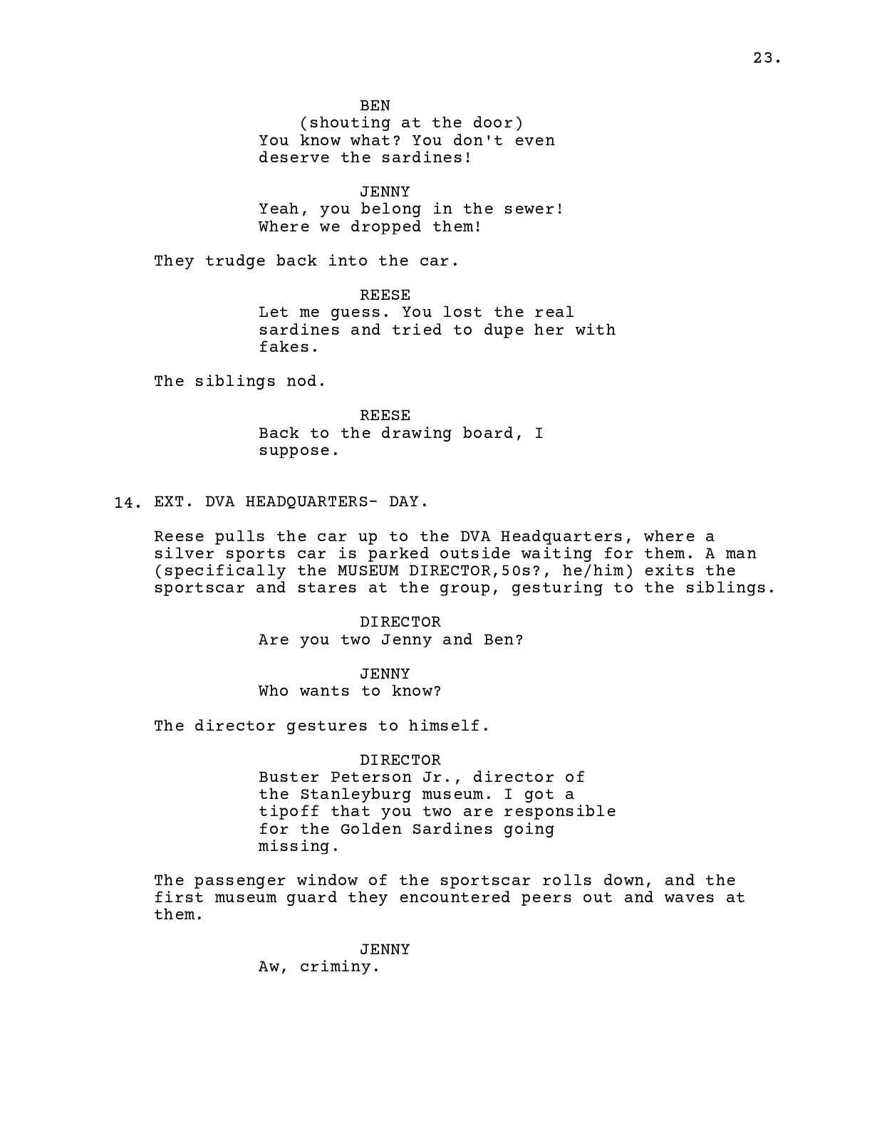 even deserve the sardines! JENNY Yeah, you belong in the sewer! Where we dropped them! They trudge back into the car. REESE Let me guess. You lost the real sardines and tried to dupe her with fakes. The siblings nod. REESE Back to the drawing board, I suppose. EXT. DVA HEADQUARTERS- DAY. Reese pulls the car up to the DVA Headquarters, where a silver sports car is parked outside waiting for them. A man (specifically the MUSEUM DIRECTOR,50s?, he/him) exits the sportscar and stares at the group, gesturing to the siblings. DIRECTOR Are you two Jenny and Ben? JENNY Who wants to know? The director gestures to himself. DIRECTOR Buster Peterson Jr., director of the Stanleyburg museum. I got a tipoff that you two are responsible for the Golden Sardines going missing. The passenger window of the sportscar rolls down, and the first museum guard they encountered peers out and waves at them. JENNY Aw, criminy. DIRECTOR 14. 23.