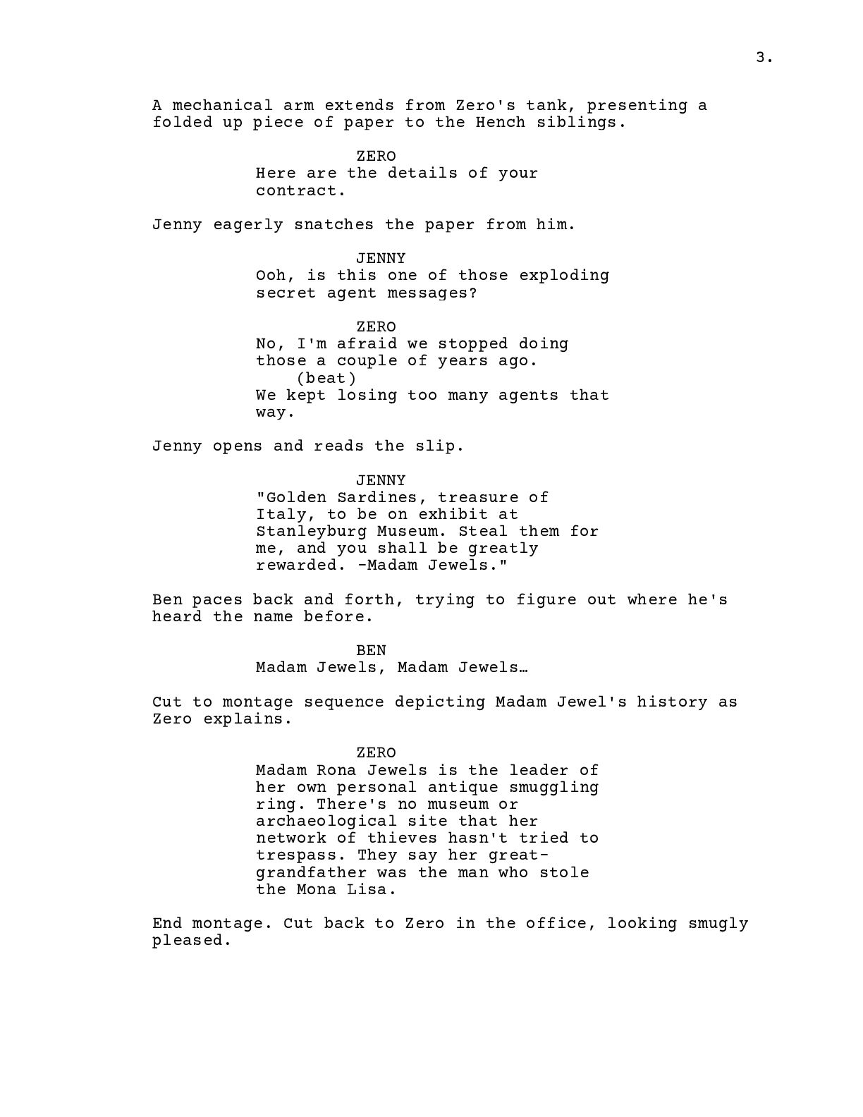 up piece of paper to the Hench siblings. ZERO Here are the details of your contract. Jenny eagerly snatches the paper from him. JENNY Ooh, is this one of those exploding secret agent messages? ZERO No, I'm afraid we stopped doing those a couple of years ago. (beat) We kept losing too many agents that way. Jenny opens and reads the slip. JENNY "Golden Sardines, treasure of Italy, to be on exhibit at Stanleyburg Museum. Steal them for me, and you shall be greatly rewarded. -Madam Jewels." Ben paces back and forth, trying to figure out where he's heard the name before. BEN Madam Jewels, Madam Jewels… Cut to montage sequence depicting Madam Jewel's history as Zero explains. ZERO Madam Rona Jewels is the leader of her own personal antique smuggling ring. There's no museum or archaeological site that her network of thieves hasn't tried to trespass. They say her great- grandfather was the man who stole the Mona Lisa. End montage. Cut back to Zero in the office, looking smugly pleased. ZERO 3.