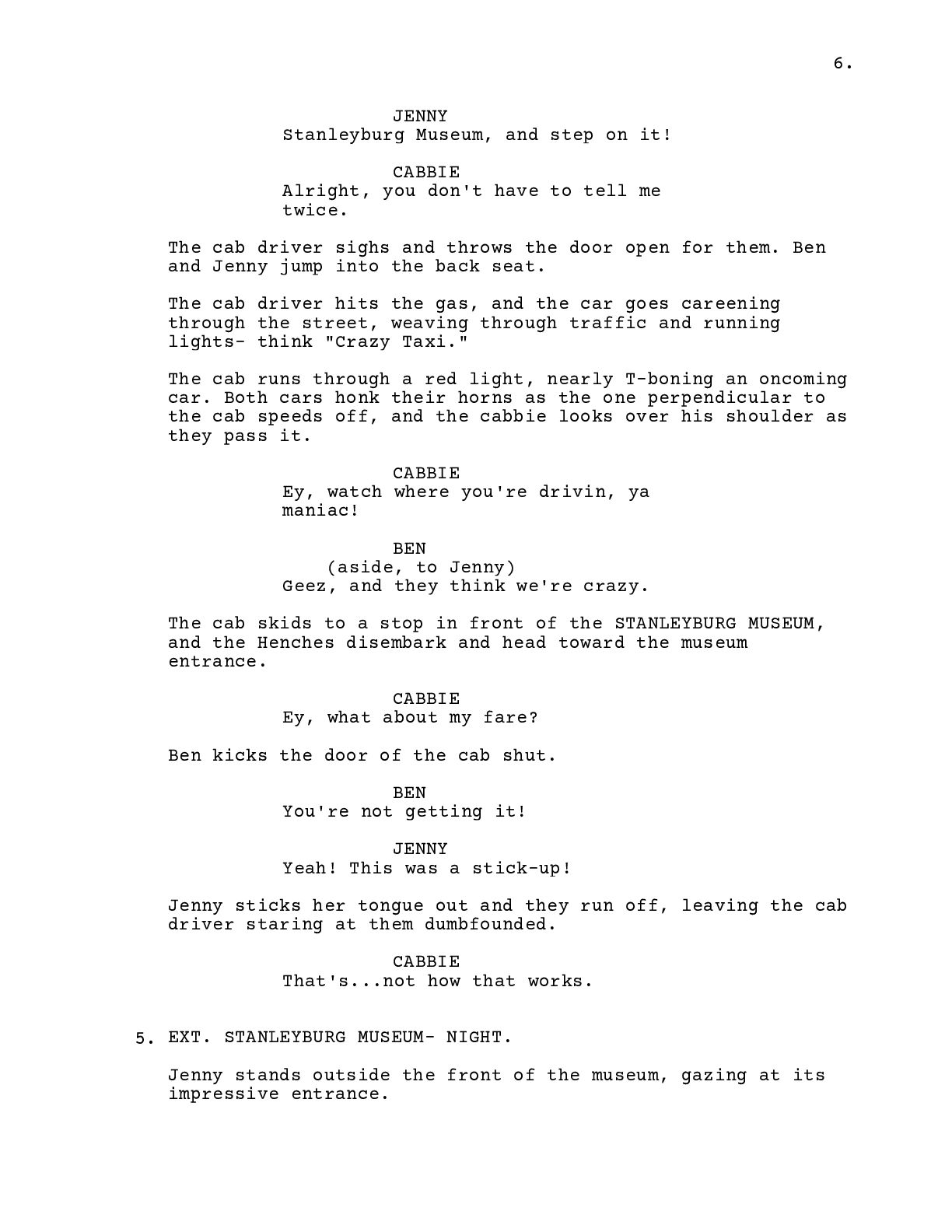 don't have to tell me twice. The cab driver sighs and throws the door open for them. Ben and Jenny jump into the back seat. The cab driver hits the gas, and the car goes careening through the street, weaving through traffic and running lights- think "Crazy Taxi." The cab runs through a red light, nearly T-boning an oncoming car. Both cars honk their horns as the one perpendicular to the cab speeds off, and the cabbie looks over his shoulder as they pass it. CABBIE Ey, watch where you're drivin, ya maniac! BEN (aside, to Jenny) Geez, and they think we're crazy. The cab skids to a stop in front of the STANLEYBURG MUSEUM, and the Henches disembark and head toward the museum entrance. CABBIE Ey, what about my fare? Ben kicks the door of the cab shut. BEN You're not getting it! JENNY Yeah! This was a stick-up! Jenny sticks her tongue out and they run off, leaving the cab driver staring at them dumbfounded. CABBIE That's...not how that works. EXT. STANLEYBURG MUSEUM- NIGHT. Jenny stands outside the front of the museum, gazing at its impressive entrance. JENNY 5. 6.