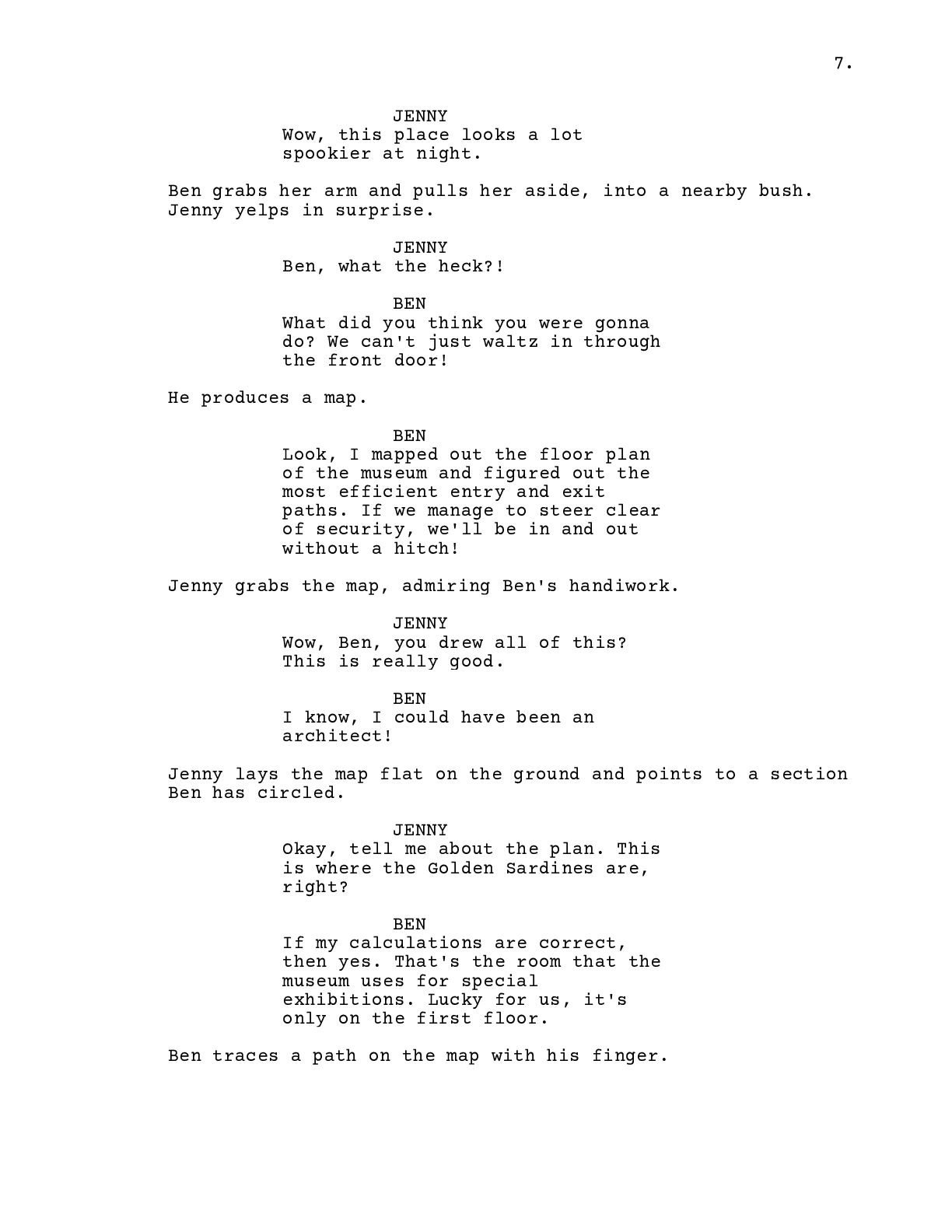 Ben grabs her arm and pulls her aside, into a nearby bush. Jenny yelps in surprise. JENNY Ben, what the heck?! BEN What did you think you were gonna do? We can't just waltz in through the front door! He produces a map. BEN Look, I mapped out the floor plan of the museum and figured out the most efficient entry and exit paths. If we manage to steer clear of security, we'll be in and out without a hitch! Jenny grabs the map, admiring Ben's handiwork. JENNY Wow, Ben, you drew all of this? This is really good. BEN I know, I could have been an architect! Jenny lays the map flat on the ground and points to a section Ben has circled. JENNY Okay, tell me about the plan. This is where the Golden Sardines are, right? BEN If my calculations are correct, then yes. That's the room that the museum uses for special exhibitions. Lucky for us, it's only on the first floor. Ben traces a path on the map with his finger. BEN 7.