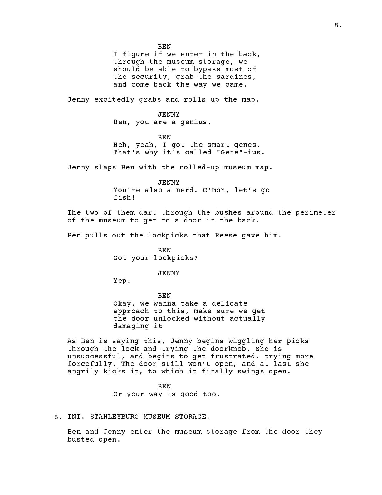the museum storage, we should be able to bypass most of the security, grab the sardines, and come back the way we came. Jenny excitedly grabs and rolls up the map. JENNY Ben, you are a genius. BEN Heh, yeah, I got the smart genes. That's why it's called "Gene"-ius. Jenny slaps Ben with the rolled-up museum map. JENNY You're also a nerd. C'mon, let's go fish! The two of them dart through the bushes around the perimeter of the museum to get to a door in the back. Ben pulls out the lockpicks that Reese gave him. BEN Got your lockpicks? JENNY Yep. BEN Okay, we wanna take a delicate approach to this, make sure we get the door unlocked without actually damaging it- As Ben is saying this, Jenny begins wiggling her picks through the lock and trying the doorknob. She is unsuccessful, and begins to get frustrated, trying more forcefully. The door still won't open, and at last she angrily kicks it, to which it finally swings open. BEN Or your way is good too. INT. STANLEYBURG MUSEUM STORAGE. Ben and Jenny enter the museum storage from the door they busted open. Jenny reaches for a nearby light switch. Ben grabs her hand, 6. 8.