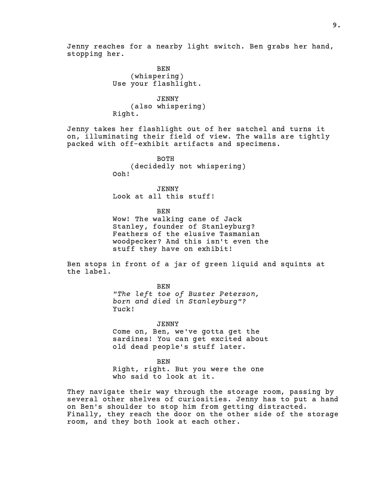 hand, stopping her. BEN (whispering) Use your flashlight. JENNY (also whispering) Right. Jenny takes her flashlight out of her satchel and turns it on, illuminating their field of view. The walls are tightly packed with off-exhibit artifacts and specimens. BOTH (decidedly not whispering) Ooh! JENNY Look at all this stuff! BEN Wow! The walking cane of Jack Stanley, founder of Stanleyburg? Feathers of the elusive Tasmanian woodpecker? And this isn't even the stuff they have on exhibit! Ben stops in front of a jar of green liquid and squints at the label. BEN "The left toe of Buster Peterson, born and died in Stanleyburg"? Yuck! JENNY Come on, Ben, we've gotta get the sardines! You can get excited about old dead people's stuff later. BEN Right, right. But you were the one who said to look at it. They navigate their way through the storage room, passing by several other shelves of curiosities. Jenny has to put a hand on Ben's shoulder to stop him from getting distracted. Finally, they reach the door on the other side of the storage room, and they both look at each other. BEN 9.