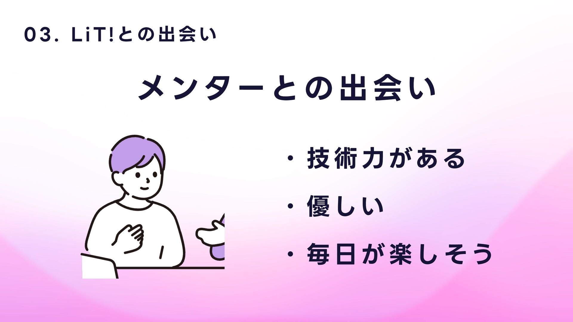 03. Li T!との出会い メンターとの 出会い ・技術 力 がある ・優しい ・毎