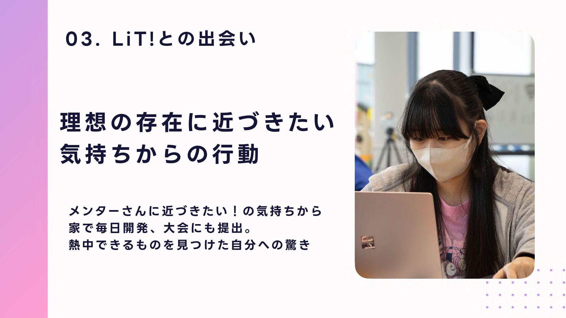 会にも提 出。 熱中できるものを 見 つけた 自 分への驚き 03. LiT! との出会い