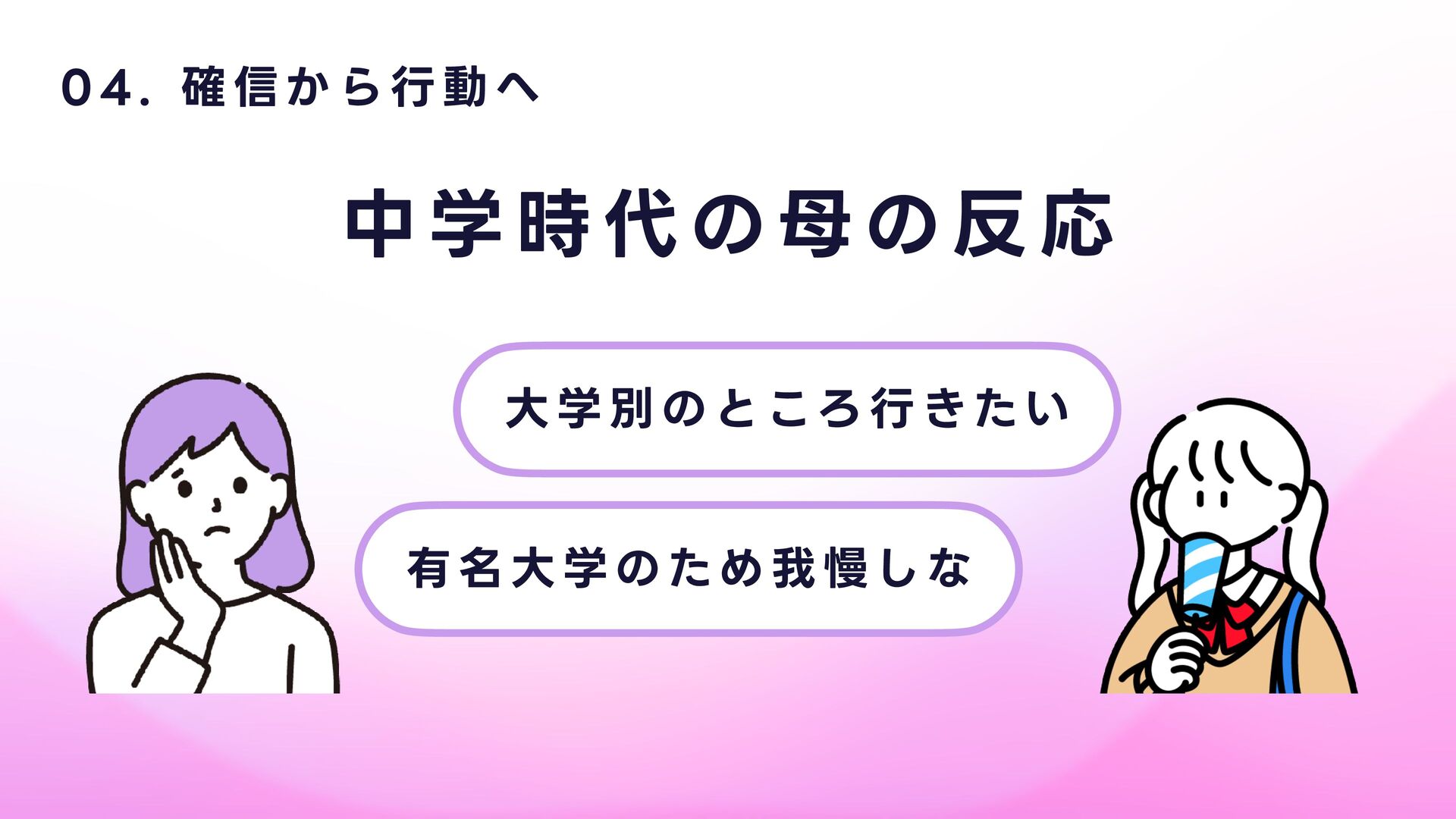 04. 確信から 行 動へ 中学時代の 母 の反応 大 学別のところ 行