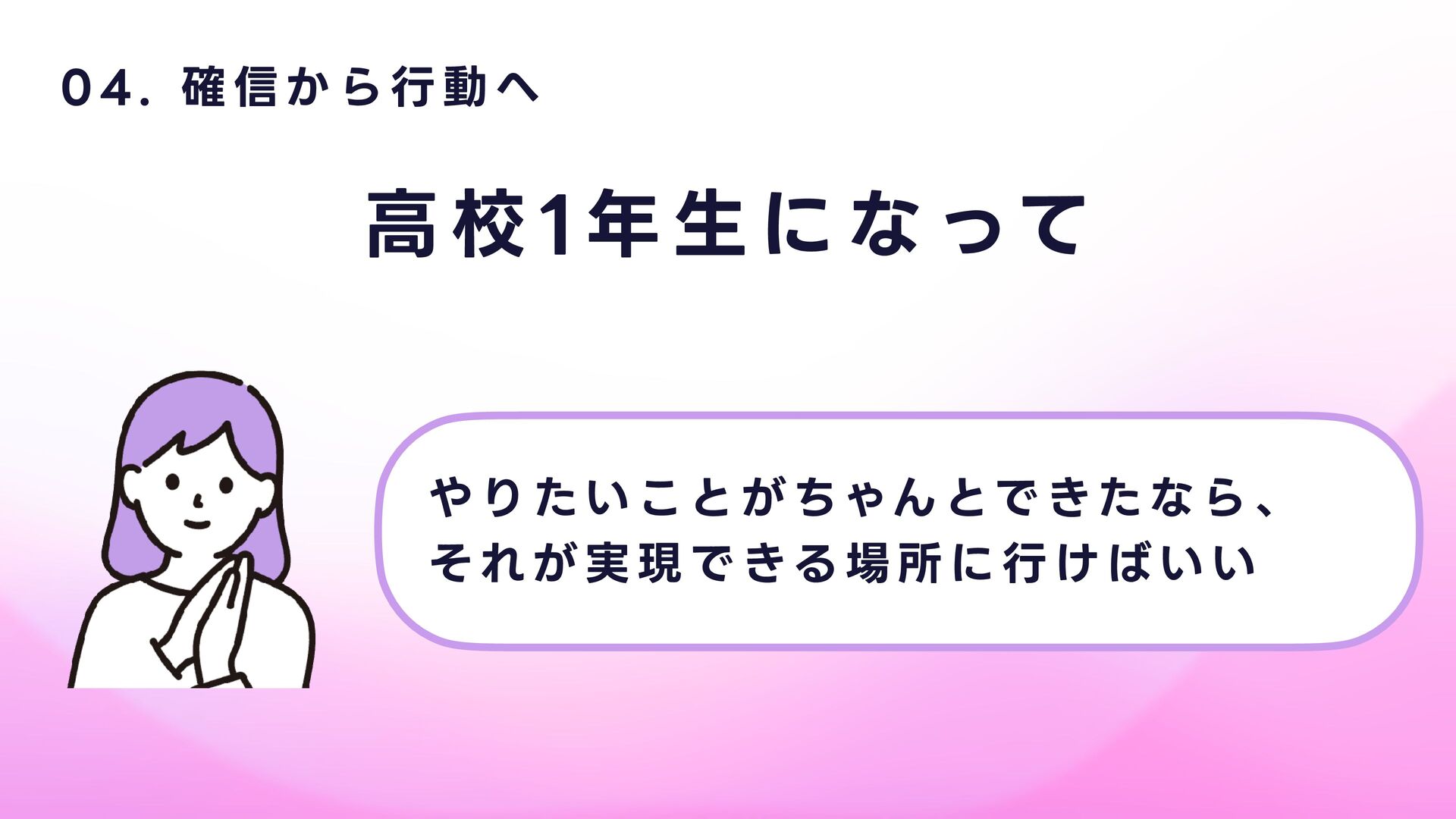 04. 確信から 行 動へ 高 校1年 生 になって やりたいことがちゃんとできたなら、 それが実現できる場所に