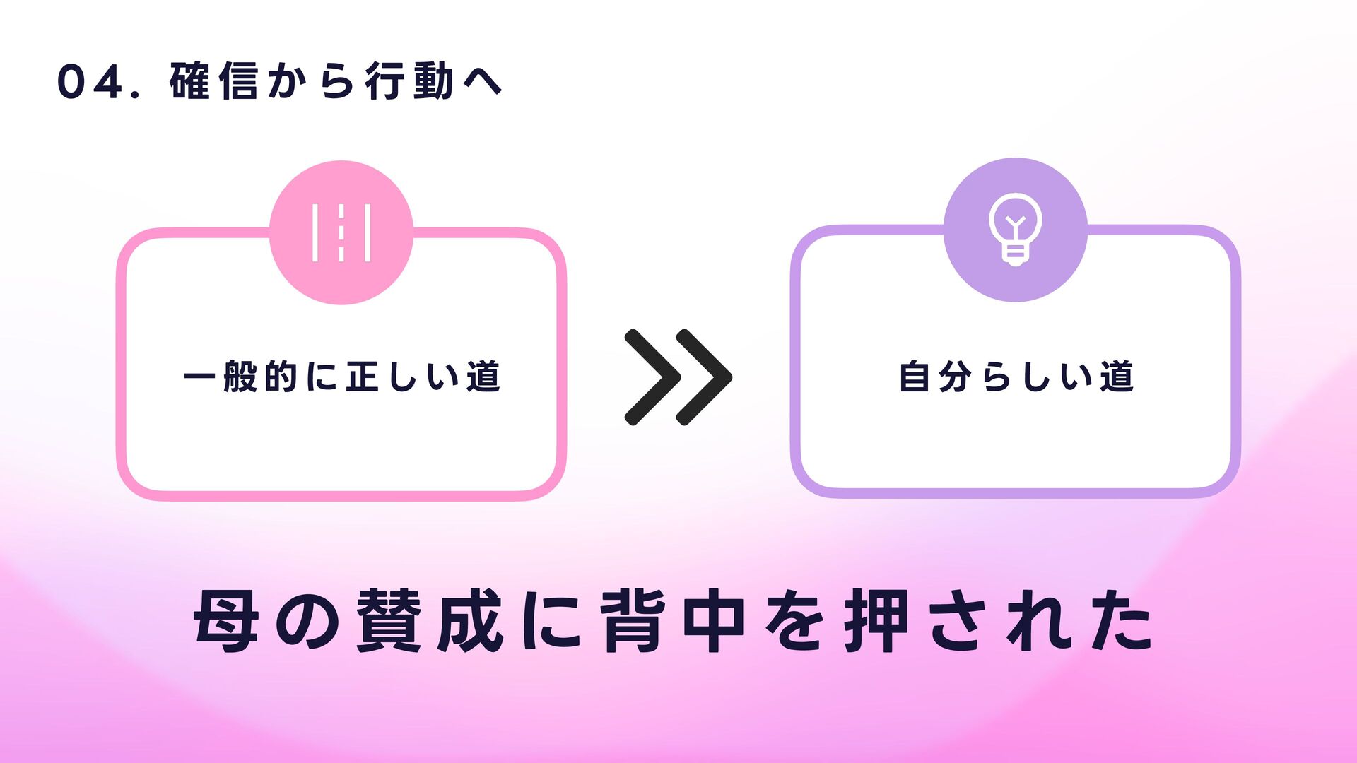 04. 確信から 行 動へ 一 般的に正しい道 自 分らしい道 母 の賛成に背中を押された