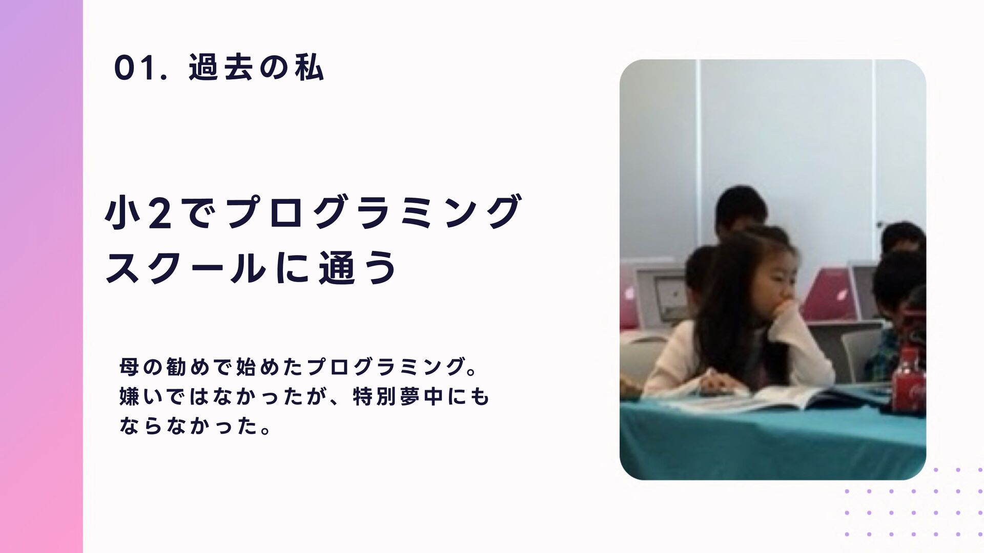 小 2でプログラミング スクールに通う 母 の勧めで始めたプログラミング。 嫌いではなかったが、特別 夢中にも ならなかった。 01. 過去の私