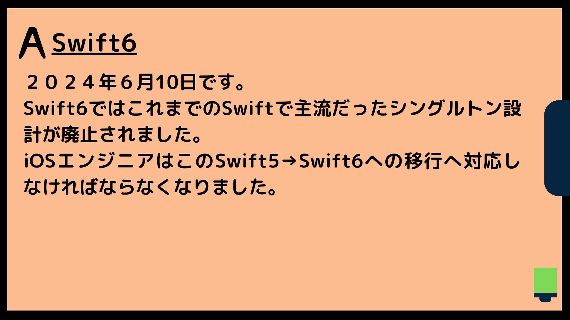 ASwift6 2024年6月10日です。 Swift6ではこれまでのSwiftで主流だったシングルトン設 計が廃止されました。 iOSエンジニアはこのSwift5→Swift6への移行へ対応し なければならなくなりました。