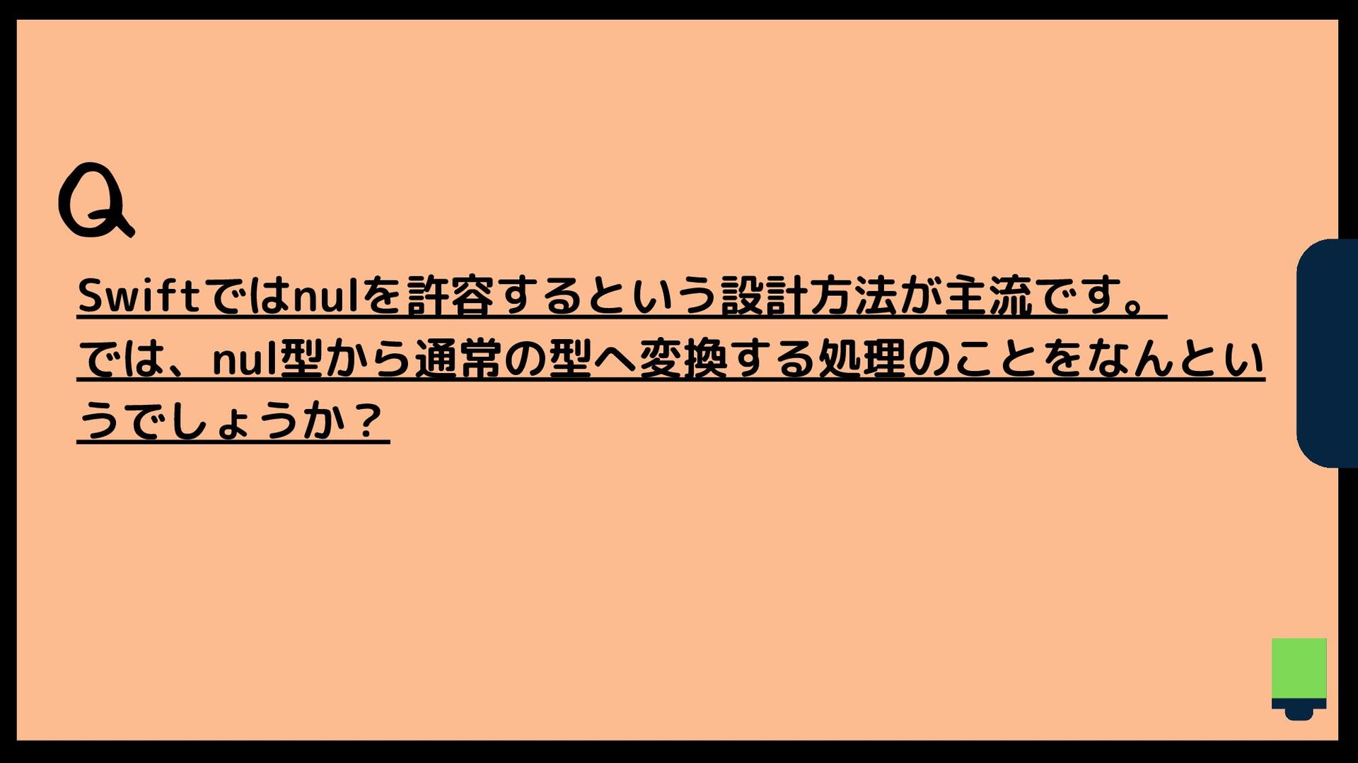 Q Swiftではnulを許容するという設計方法が主流です。 では、nul型から通常の型へ変換する処理のことをなんとい うでしょうか?
