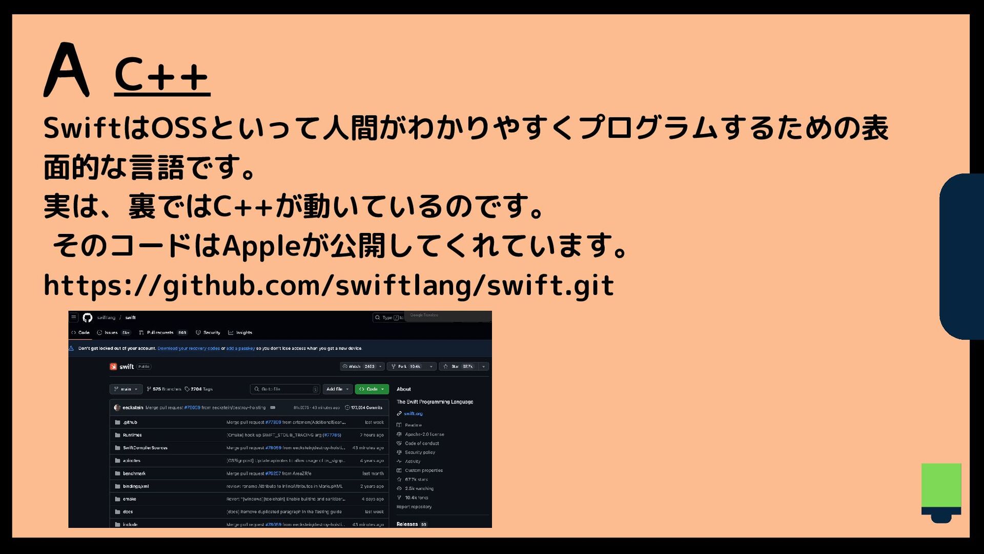 A C++ SwiftはOSSといって人間がわかりやすくプログラムするための表 面的な言語です。 実は、裏ではC++が動いているのです。 そのコードはAppleが公開してくれています。 https://github.com/swiftlang/swift.git