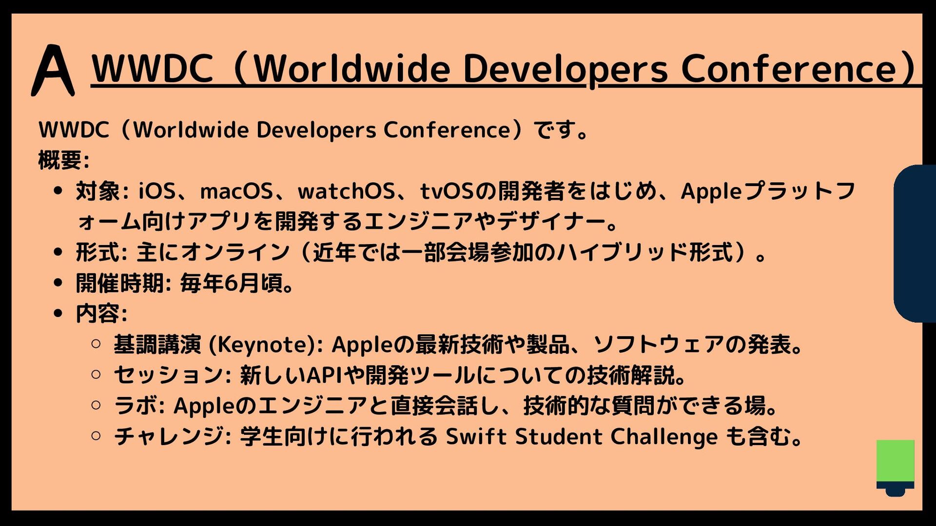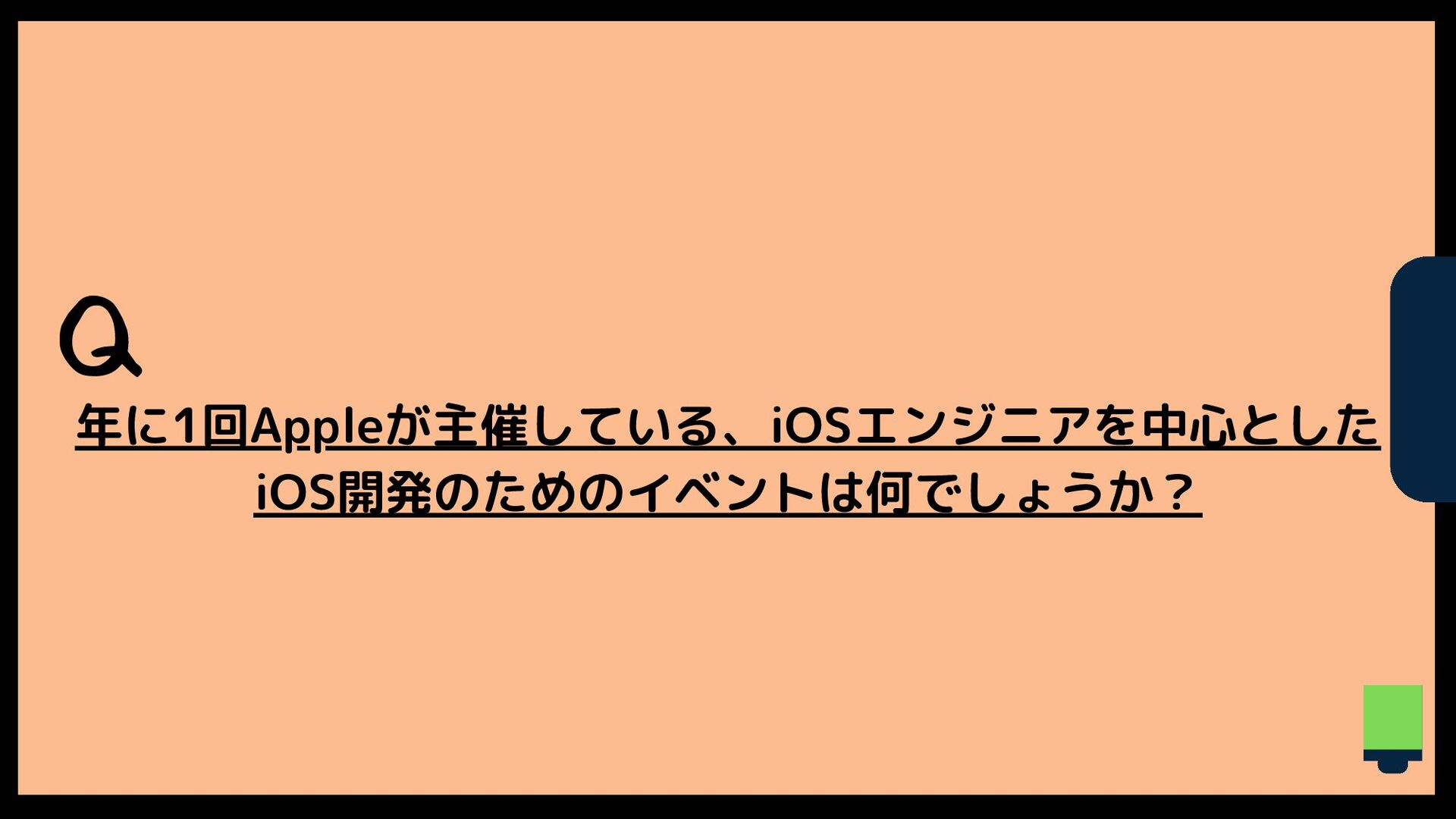 Q 年に1回Appleが主催している、iOSエンジニアを中心とした iOS開発のためのイベントは何でしょうか?