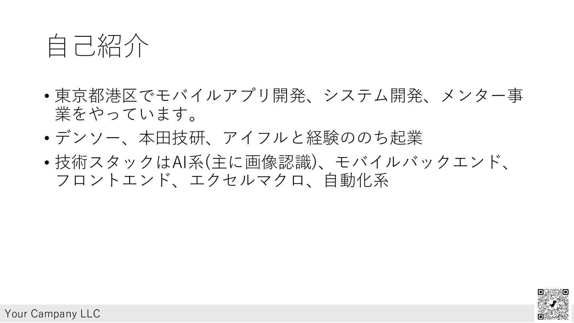 自己紹介 • 東京都港区でモバイルアプリ開発、システム開発、メンター事 業をやっています。 • デンソー、本田技研、アイフルと経験ののち起業 • 技術スタックはAI系(主に画像認識)、モバイルバックエンド、 フロントエンド、エクセルマクロ、自動化系 Your