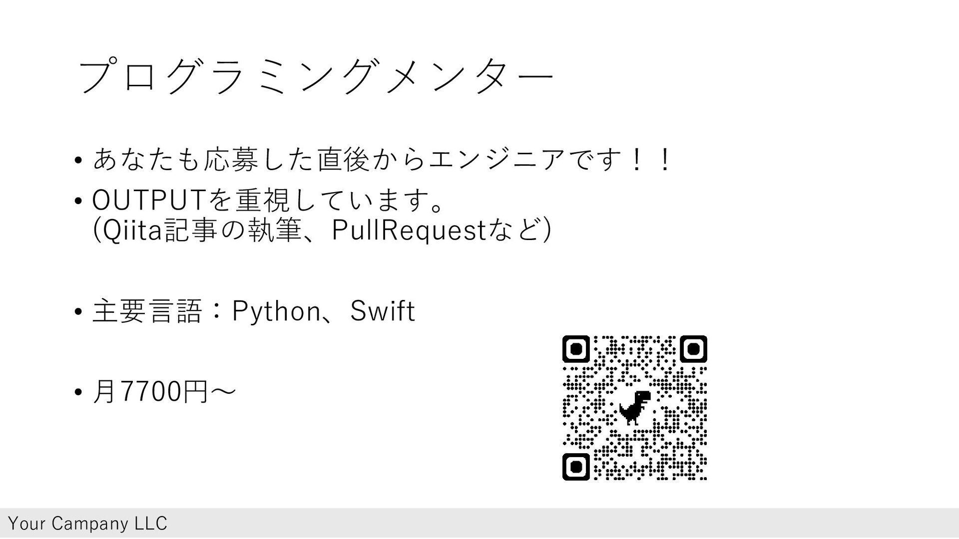 プログラミングメンター • あなたも応募した直後からエンジニアです!! • OUTPUTを重視しています。 (Qiita記事の執筆、PullRequestなど) • 主要言語:Python、Swift • 月7700円〜