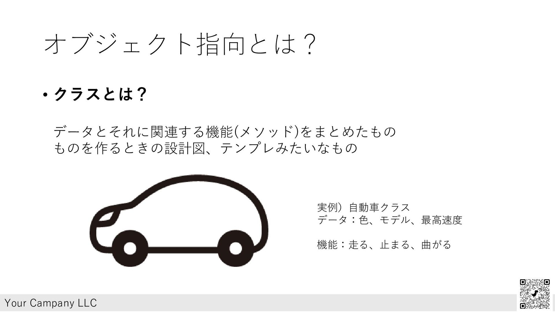 オブジェクト指向とは? • クラスとは? データとそれに関連する機能(メソッド)をまとめたもの ものを作るときの設計図、テンプレみたいなもの Your Campany LLC 実例)自動車クラス データ:色、モデル、最高速度