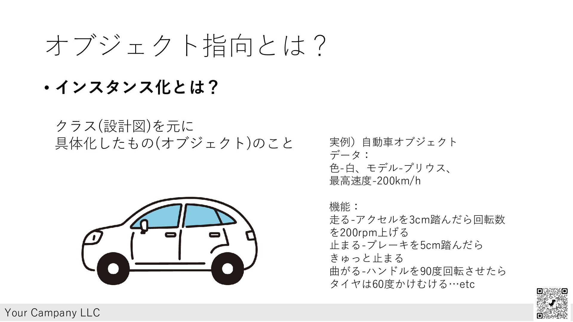 オブジェクト指向とは? • インスタンス化とは? クラス(設計図)を元に 具体化したもの(オブジェクト)のこと Your Campany LLC 実例)自動車オブジェクト データ: