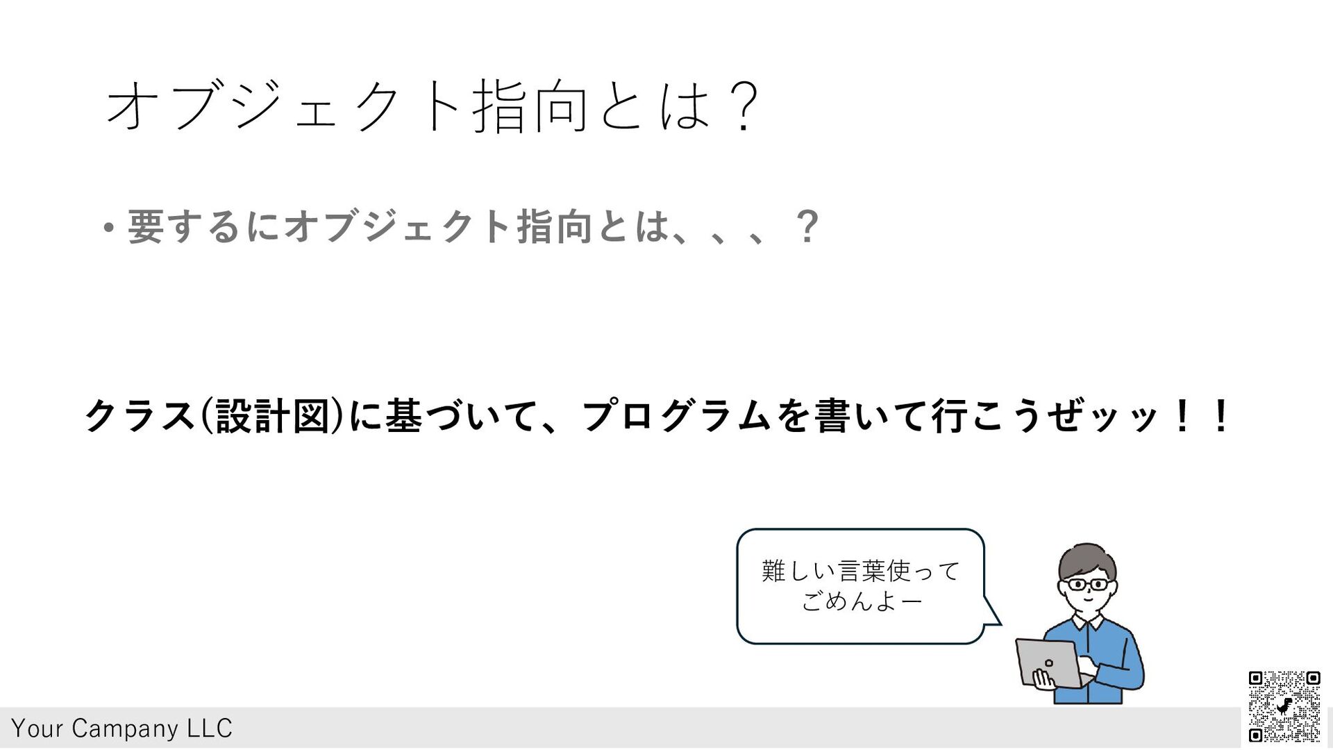 オブジェクト指向とは? • 要するにオブジェクト指向とは、、、? Your Campany LLC クラス(設計図)に基づいて、プログラムを書いて行こうぜッッ!! 難しい言葉使って ごめんよー