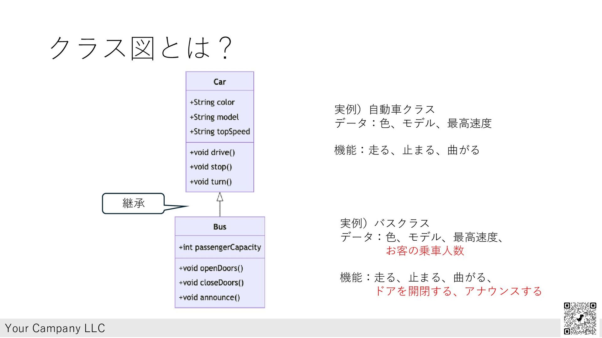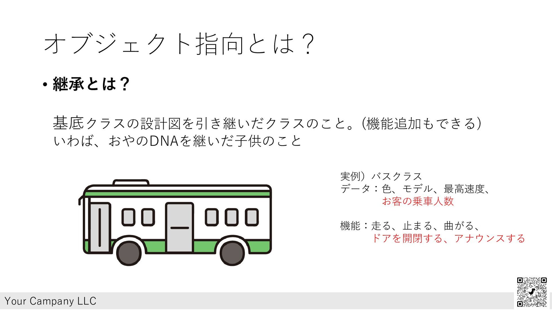 オブジェクト指向とは? • 継承とは? 基底クラスの設計図を引き継いだクラスのこと。(機能追加もできる) いわば、おやのDNAを継いだ子供のこと Your Campany LLC 実例)バスクラス データ:色、モデル、最高速度、