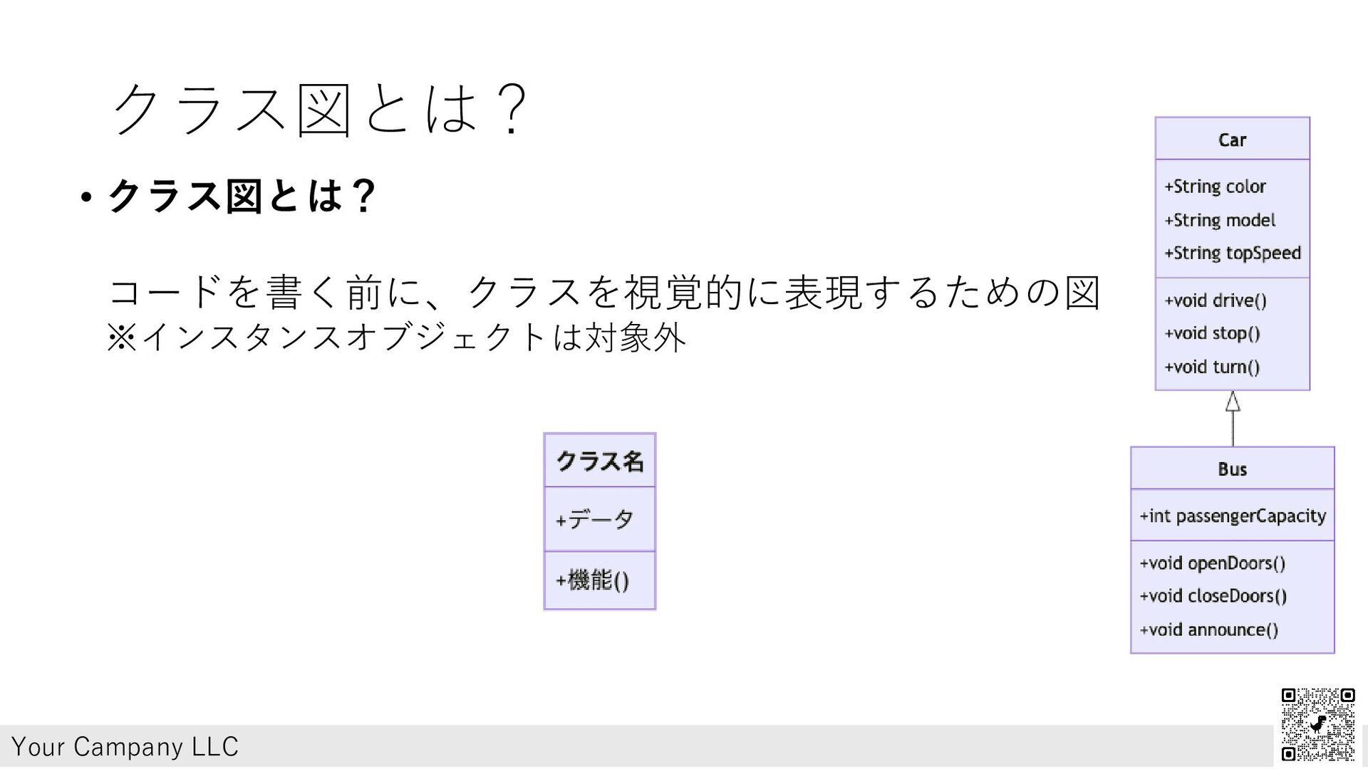 クラス図とは? • クラス図とは? コードを書く前に、クラスを視覚的に表現するための図 ※インスタンスオブジェクトは対象外 Your Campany LLC