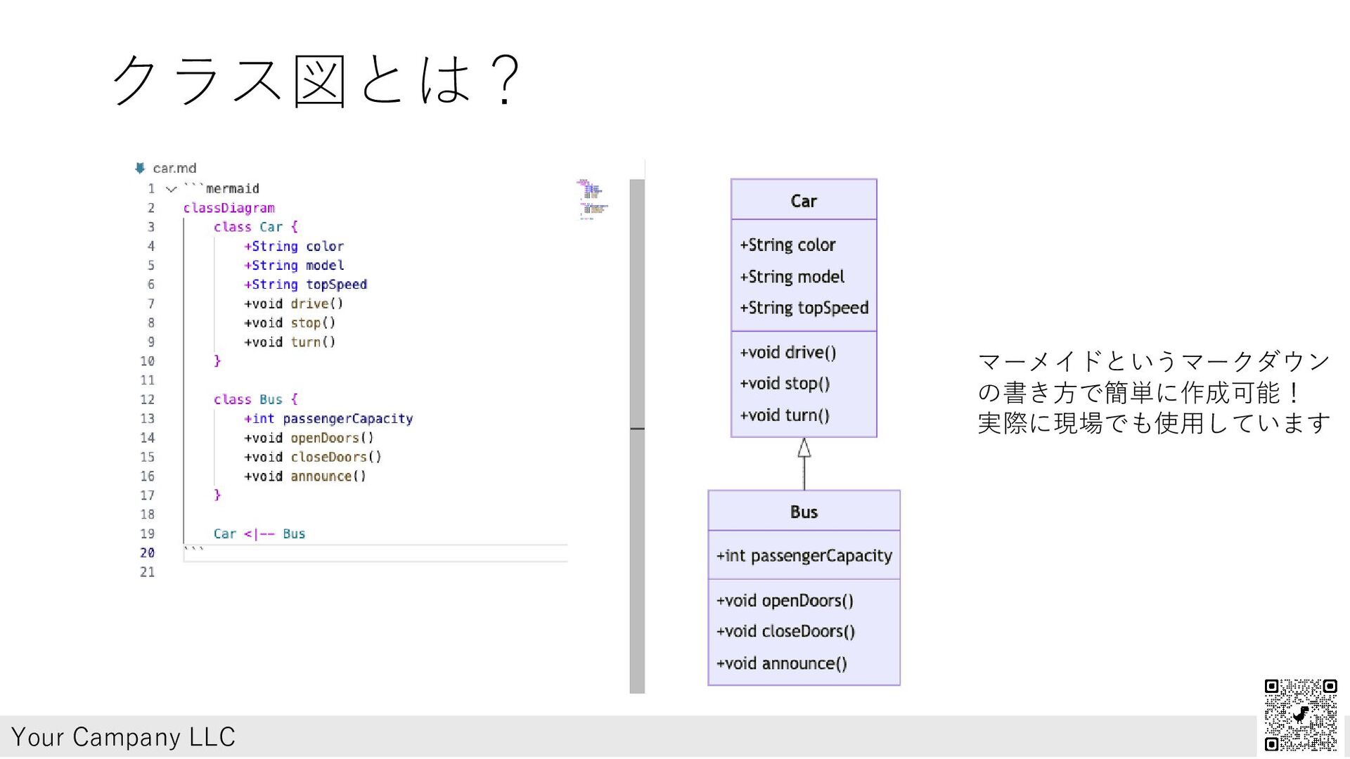 クラス図とは? Your Campany LLC マーメイドというマークダウン の書き方で簡単に作成可能! 実際に現場でも使用しています