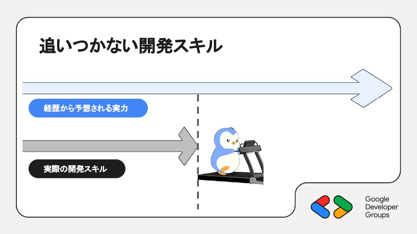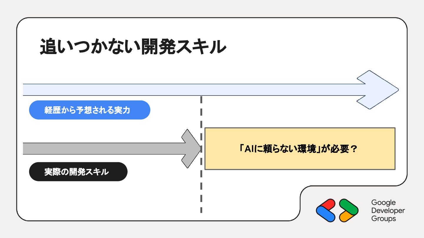追いつかない開発スキル 実際の開発スキル 経歴から予想される実力 「AIに頼らない環境」が必要?