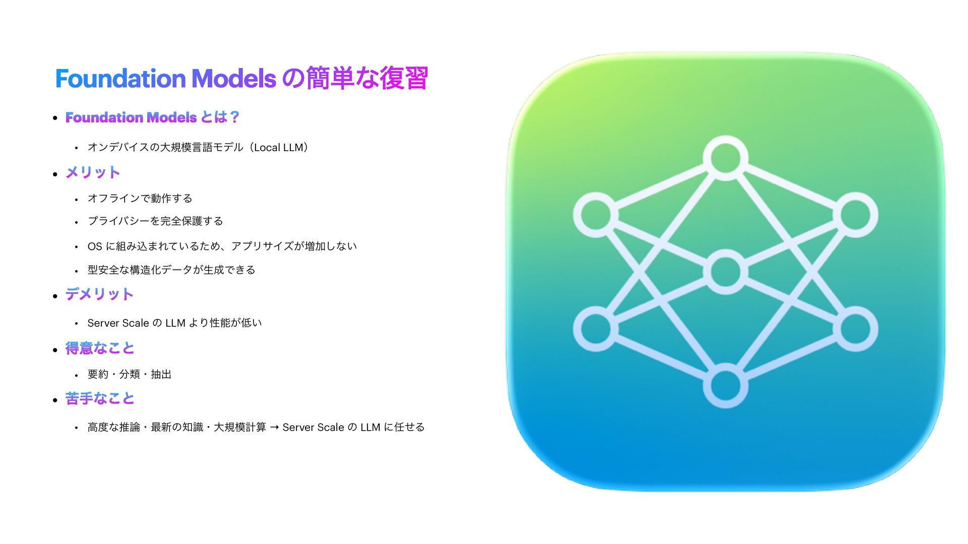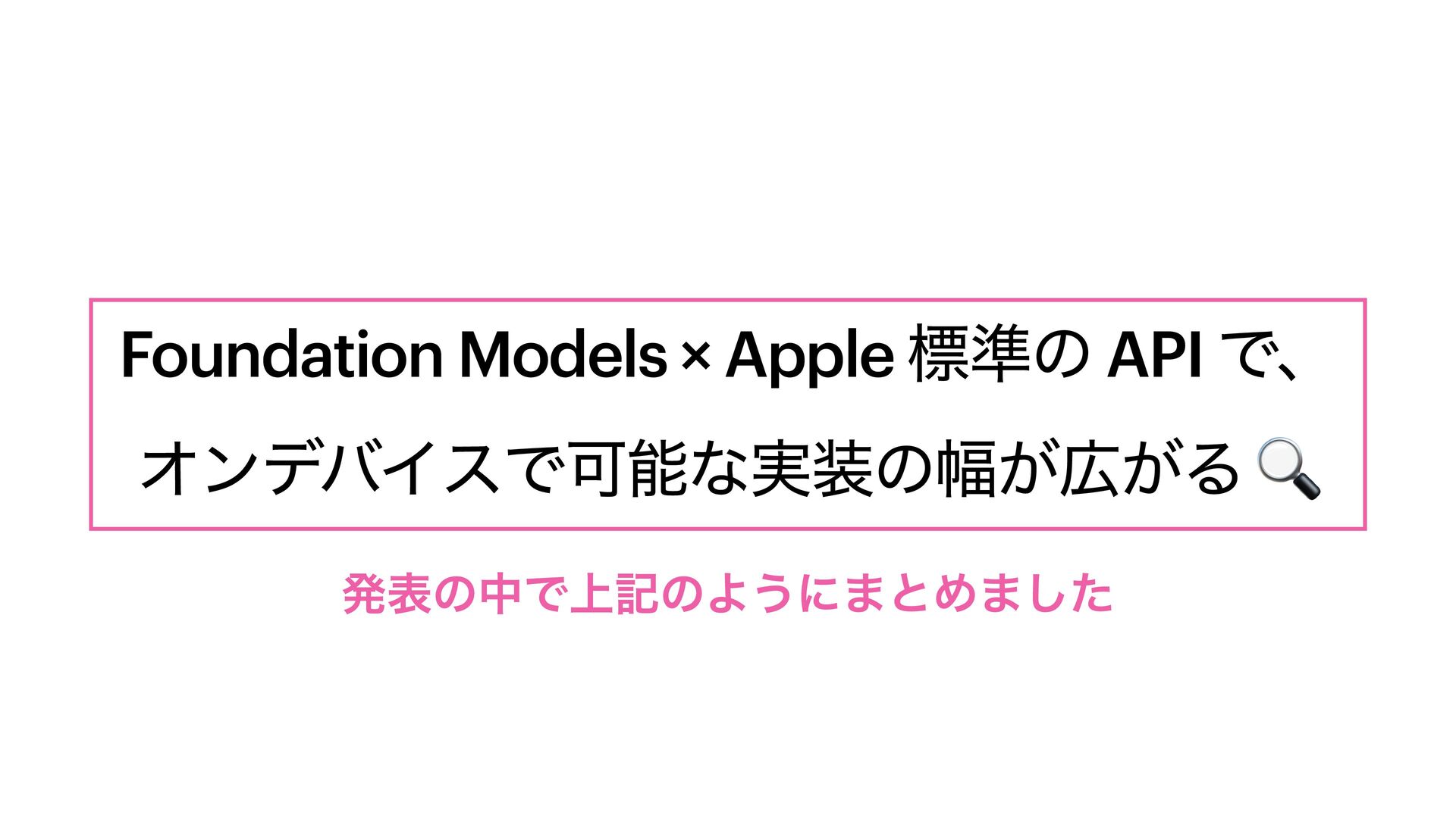 Foundation Models × Apple ඪ४ͷ API Ͱɺ ΦϯσόΠεͰՄೳͳ࣮ͷ෯͕͕Δ 🔍 ൃදͷதͰ্هͷΑ͏ʹ·ͱΊ·ͨ͠