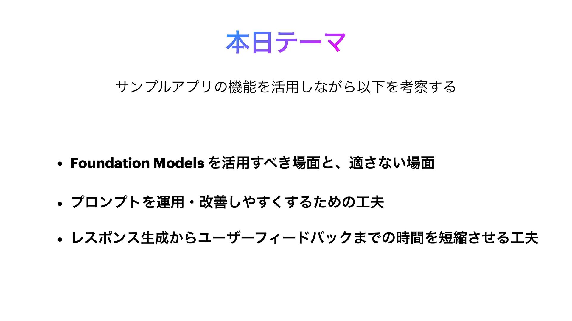 ຊςʔϚ • Foundation Models Λ׆༻͖͢໘ͱɺద͞ͳ͍໘ • ϓϩϯϓτΛӡ༻ɾվળ͘͢͢͠ΔͨΊͷ • Ϩεϙϯεੜ͔ΒϢʔβʔϑΟʔυόοΫ·Ͱͷ࣌ؒΛॖͤ͞Δ αϯϓϧΞϓϦͷػೳΛ׆༻͠ͳ͕ΒҎԼΛߟ͢Δ
