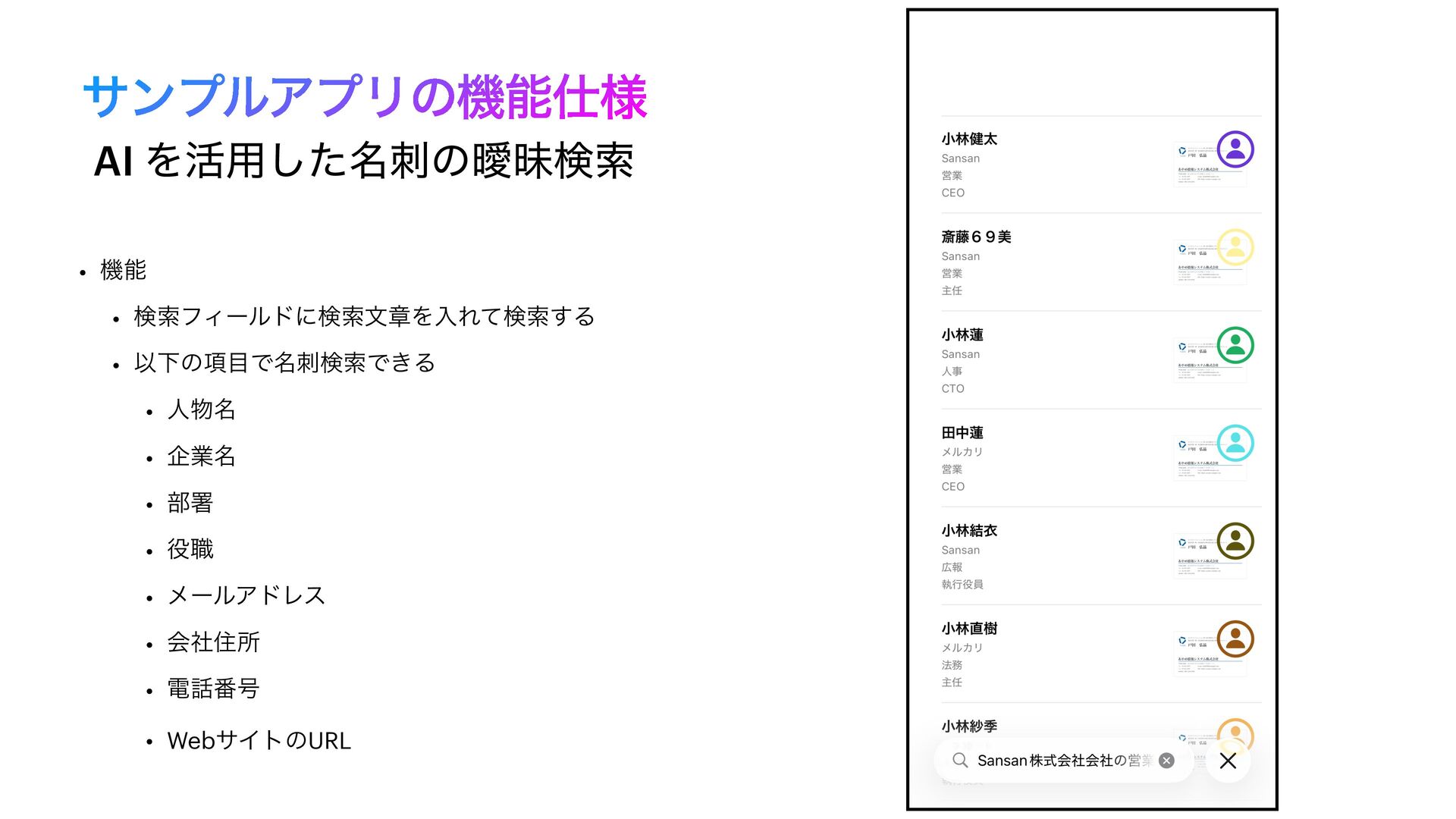 αϯϓϧΞϓϦͷػೳ༷ • ػೳ • ݕࡧϑΟʔϧυʹݕࡧจষΛೖΕͯݕࡧ͢Δ • ҎԼͷ߲Ͱ໊ݕࡧͰ͖Δ • ਓ໊ •