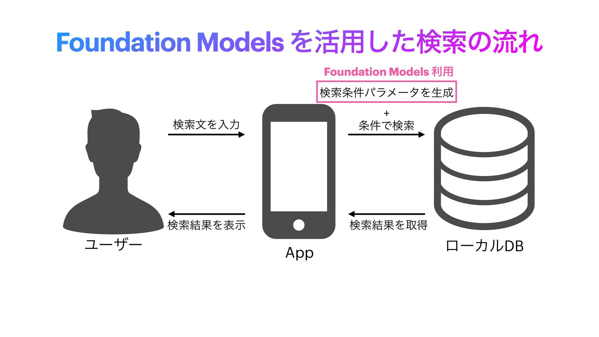 Foundation Models Λ׆༻ͨ͠ݕࡧͷྲྀΕ ϩʔΧϧDB App Ϣʔβʔ ݕࡧจΛೖྗ ݕࡧ݁ՌΛදࣔ ݕࡧ݅ύϥϝʔλΛੜ +