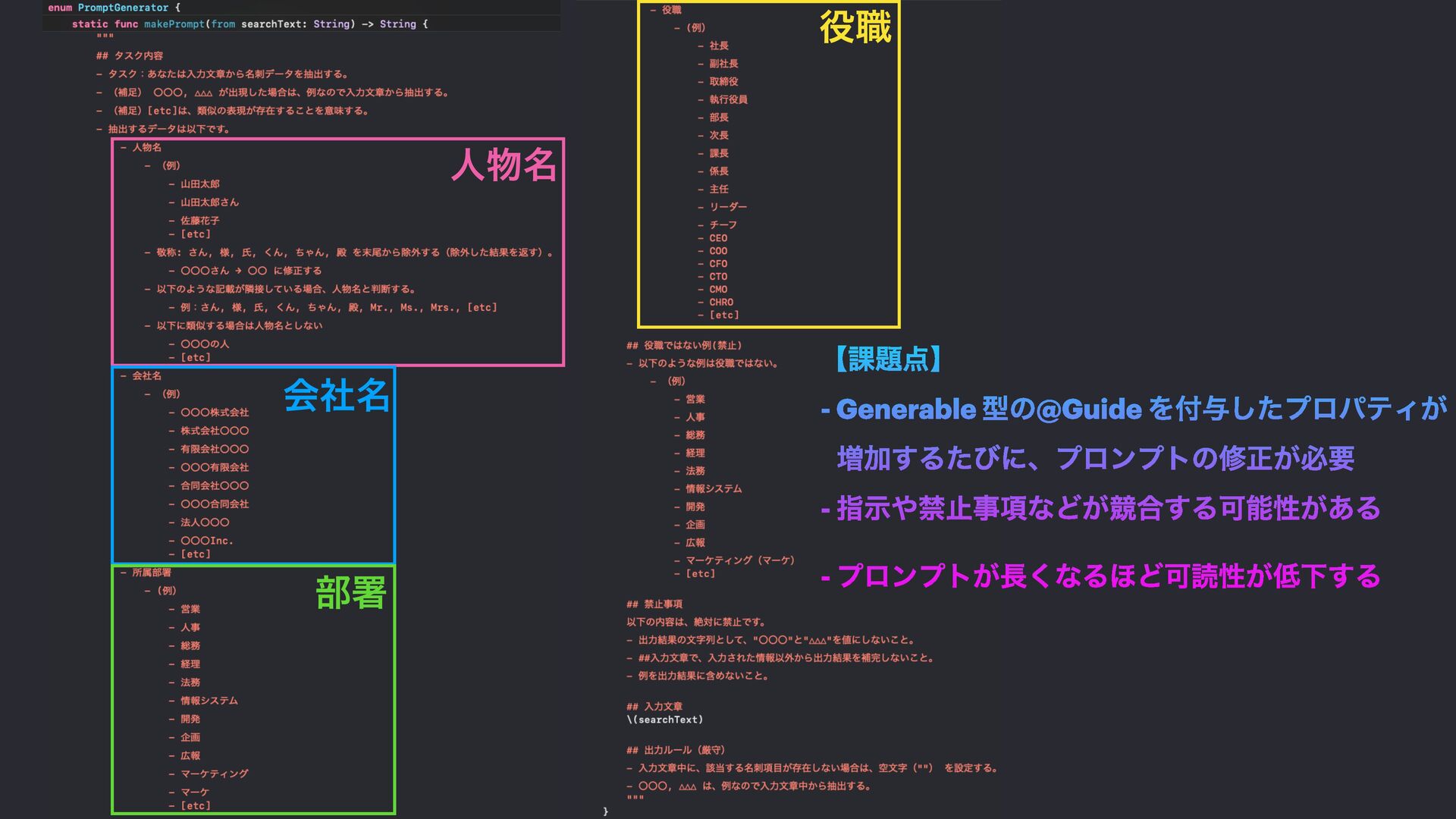 ਓ໊ ձ໊ࣾ ෦ॺ ৬ ʲ՝ʳ - Generable ܕͷ@Guide Λ༩ͨ͠ϓϩύςΟ͕ ૿Ճ͢Δͨͼʹɺϓϩϯϓτͷमਖ਼͕ඞཁ