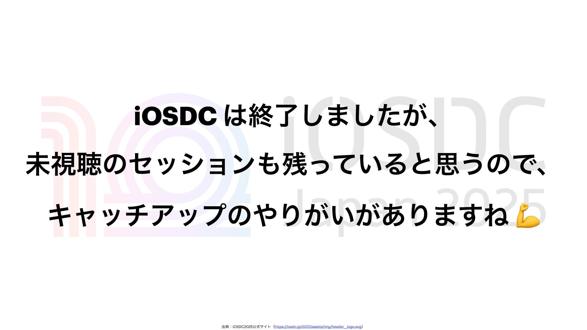 ग़యɿiOSDC2025ެࣜαΠτʢhttps://iosdc.jp/2025/assets/img/header__logo.svgʣ iOSDC ऴྃ͠·͕ͨ͠ɺ ະࢹௌͷηογϣϯ͍ͬͯΔͱࢥ͏ͷͰɺ ΩϟονΞοϓͷΓ͕͍͕͋Γ·͢Ͷ 💪