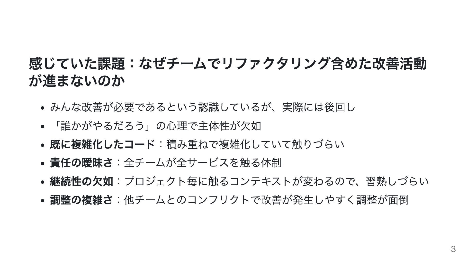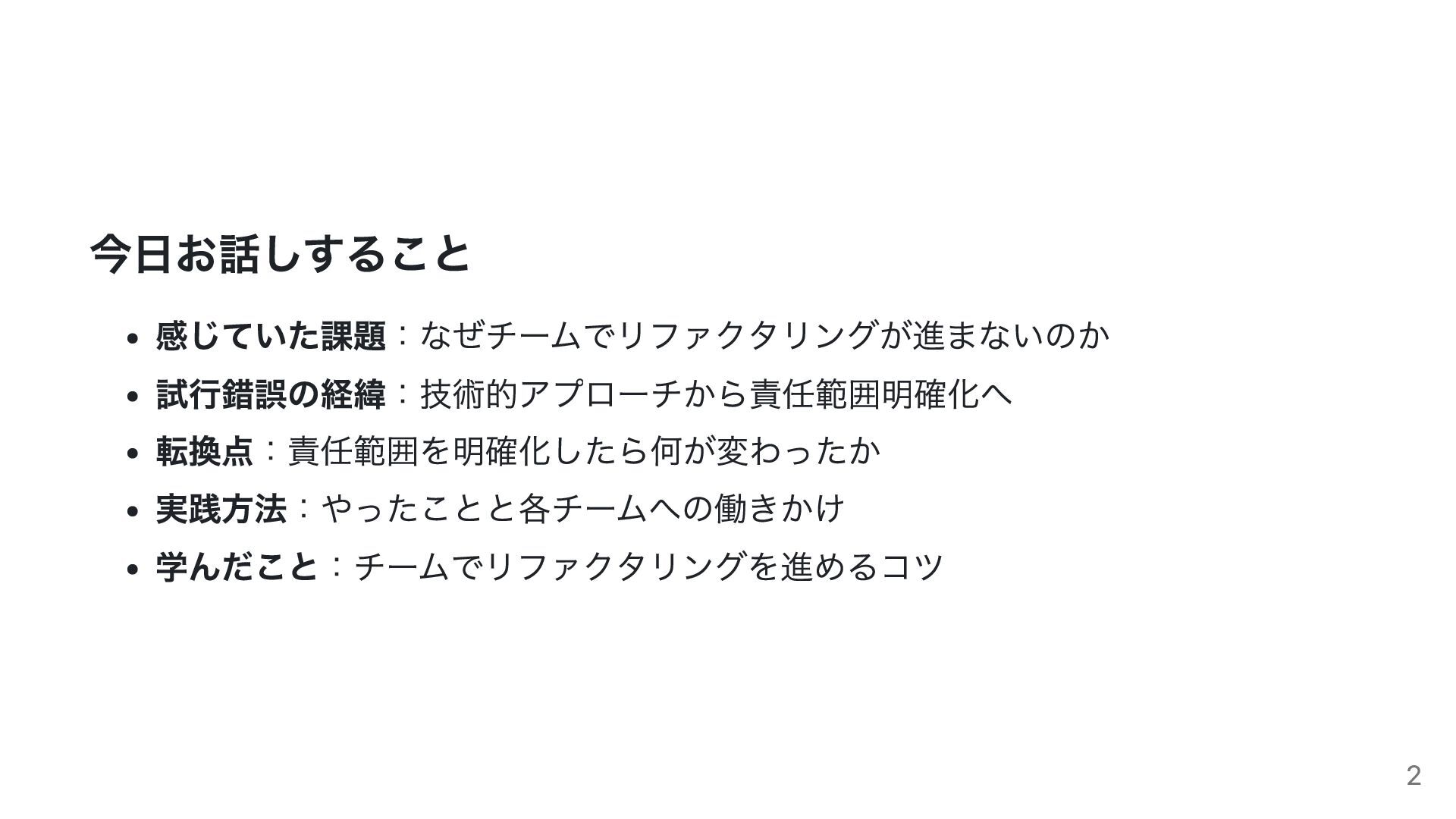 今日お話しすること 感じていた課題:なぜチームでリファクタリングが進まないのか 試行錯誤の経緯:技術的アプローチから責任範囲明確化へ 転換点:責任範囲を明確化したら何が変わったか 実践方法:やったことと各チームへの働きかけ 学んだこと:チームでリファクタリングを進めるコツ 2