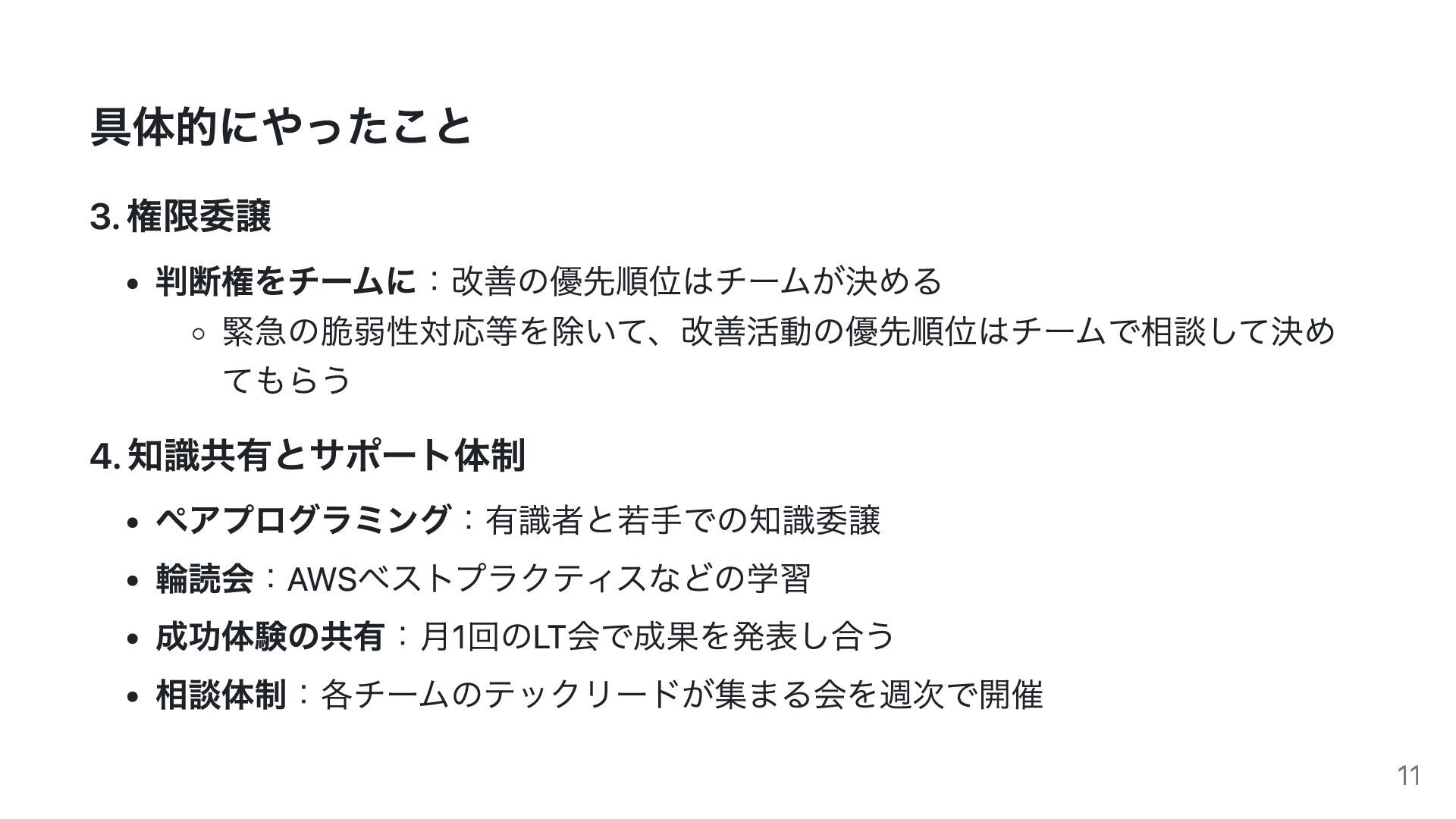 具体的にやったこと 3. 権限委譲 判断権をチームに:改善の優先順位はチームが決める 緊急の脆弱性対応等を除いて、改善活動の優先順位はチームで相談して決め てもらう 4. 知識共有とサポート体制 ペアプログラミング:有識者と若手での知識委譲 輪読会:AWSベストプラクティスなどの学習