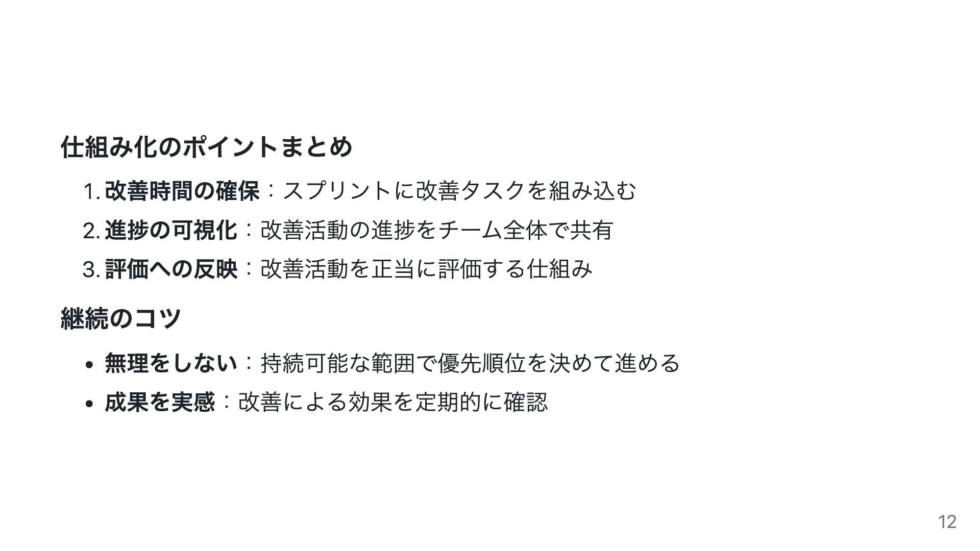 仕組み化のポイントまとめ 1. 改善時間の確保:スプリントに改善タスクを組み込む 2. 進捗の可視化:改善活動の進捗をチーム全体で共有 3. 評価への反映:改善活動を正当に評価する仕組み 継続のコツ 無理をしない:持続可能な範囲で優先順位を決めて進める 成果を実感:改善による効果を定期的に確認