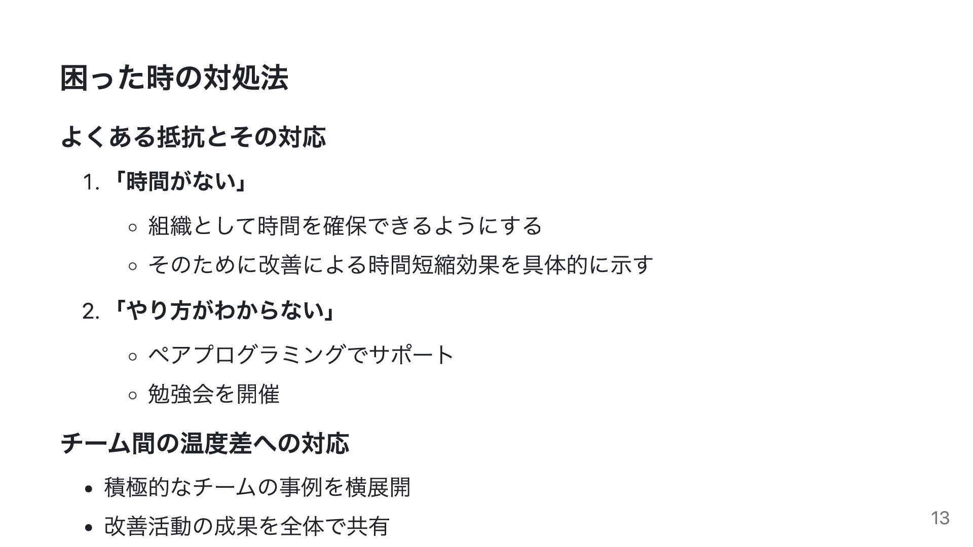 困った時の対処法 よくある抵抗とその対応 1. 「時間がない」 組織として時間を確保できるようにする そのために改善による時間短縮効果を具体的に示す 2. 「やり方がわからない」 ペアプログラミングでサポート 勉強会を開催