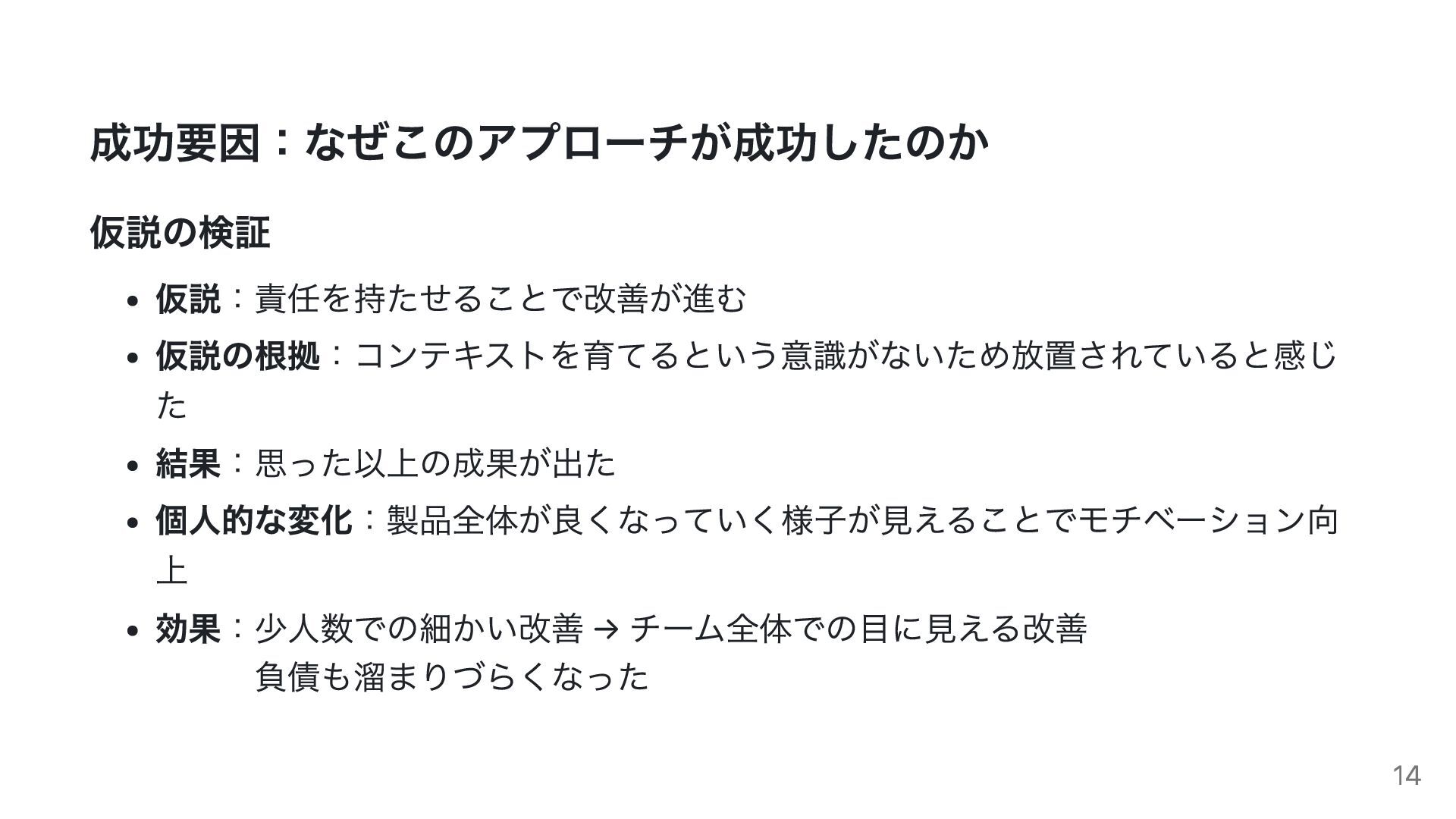 成功要因:なぜこのアプローチが成功したのか 仮説の検証 仮説:責任を持たせることで改善が進む 仮説の根拠:コンテキストを育てるという意識がないため放置されていると感じ た 結果:思った以上の成果が出た 個人的な変化:製品全体が良くなっていく様子が見えることでモチベーション向 上 効果:少人数での細かい改善 →