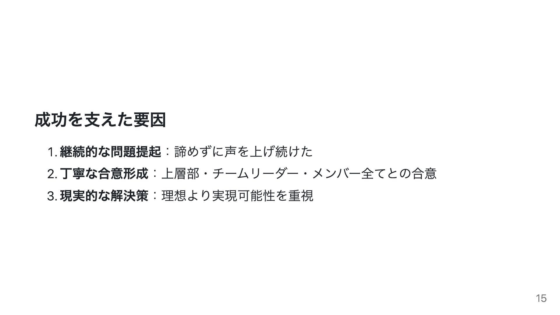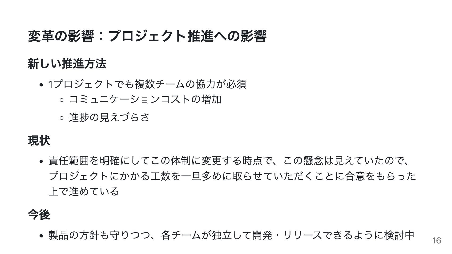 成功を支えた要因 1. 継続的な問題提起:諦めずに声を上げ続けた 2. 丁寧な合意形成:上層部・チームリーダー・メンバー全てとの合意 3. 現実的な解決策:理想より実現可能性を重視 15