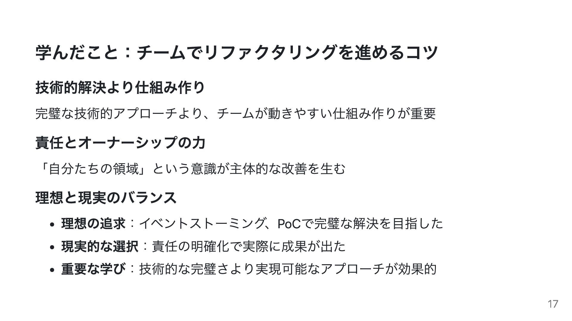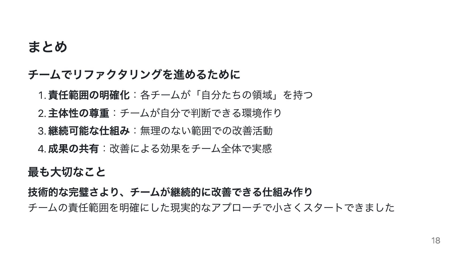 まとめ チームでリファクタリングを進めるために 1. 責任範囲の明確化:各チームが「自分たちの領域」を持つ 2. 主体性の尊重:チームが自分で判断できる環境作り 3. 継続可能な仕組み:無理のない範囲での改善活動 4. 成果の共有:改善による効果をチーム全体で実感