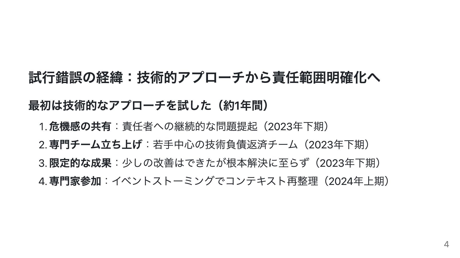試行錯誤の経緯:技術的アプローチから責任範囲明確化へ 最初は技術的なアプローチを試した(約1年間) 1. 危機感の共有:責任者への継続的な問題提起(2023年下期) 2. 専門チーム立ち上げ:若手中心の技術負債返済チーム(2023年下期) 3. 限定的な成果:少しの改善はできたが根本解決に至らず(2023年下期) 4. 専門家参加:イベントストーミングでコンテキスト再整理(2024年上期)